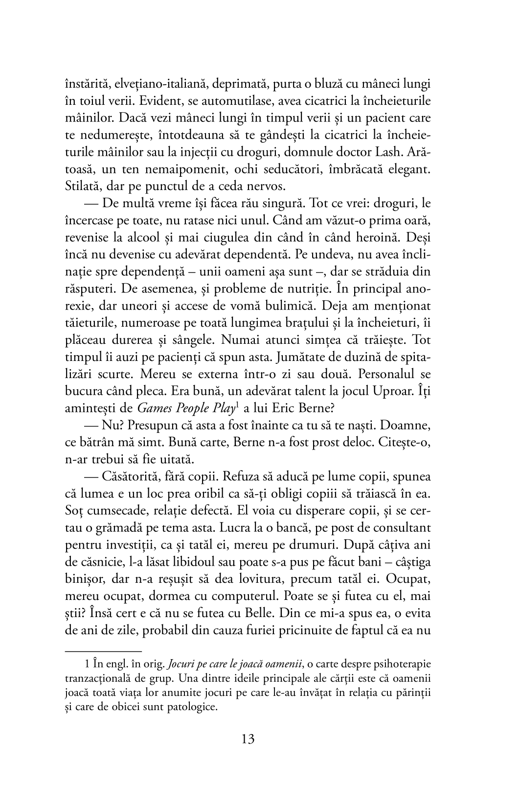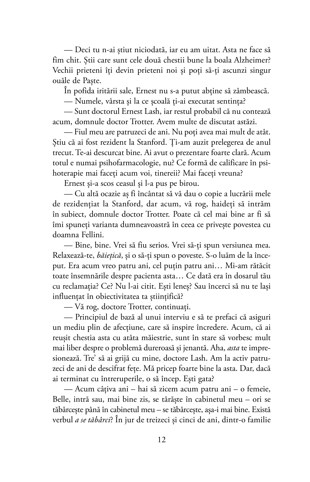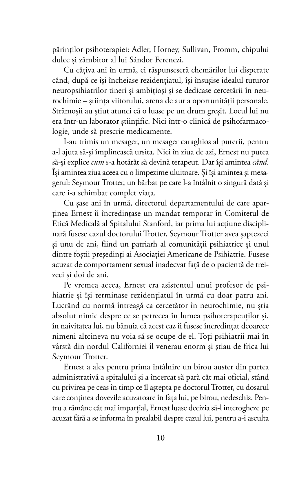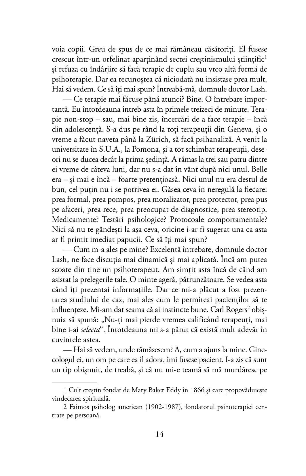Încrezător în propriile forţe, tânărul psihanalist Ernest Lash nu ia în seamă sfaturile mentorului său, Marshal Streider, ci re-curge, în timpul şedinţelor de terapie, la tehnici experimentale. Însă, în ciuda infa-tuării psihiatrilor, mintea omenească este un teritoriu încă necartografiat şi plin de primejdii: stabilind o relaţie sinceră - crede el - cu o nouă pacientă, Carolyne Leftman, Ernest îşi deschide tainiţele sufletului şi devine vulnerabil, neavând habar că femeia pe care îşi închipuie că o tra-tează doreşte de fapt să-l manipuleze şi să-l distrugă. Prins într-o paradoxală relaţie terapeutică, în care figura autoritară a medicului a cedat tentaţiei confesiunii şi i se supune pacientului dominator, Ernest va descoperi nebănuite adevăruri incomode despre sine şi despre natura umană, ale cărei taine credea că le cunoaşte.