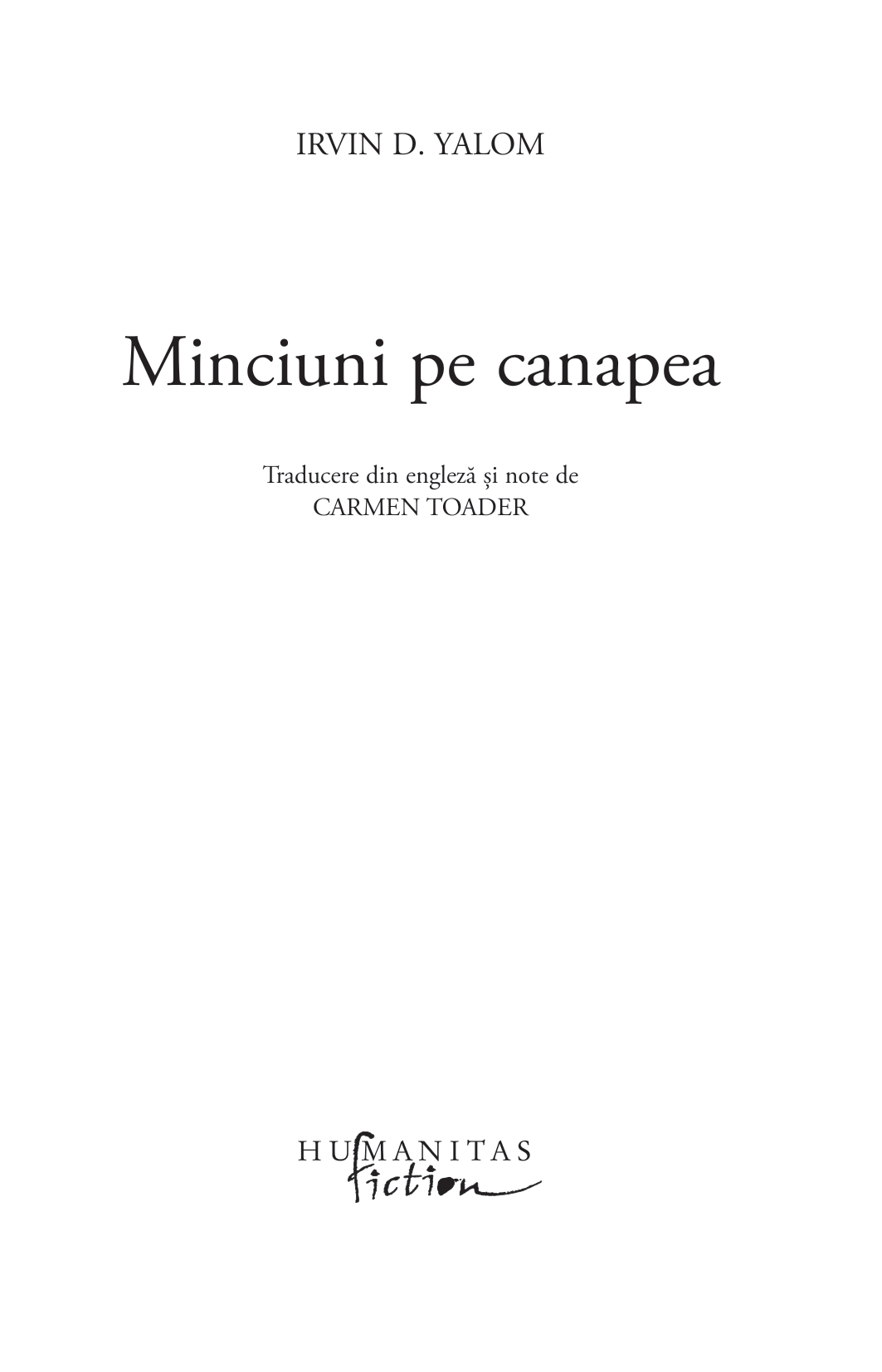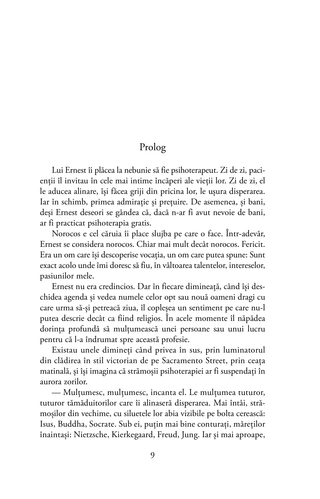 Îşi poate pierde un psihiatru minţile? Poate fi el păcălit, sedus, manipulat chiar în timpul şedinţelor în care ar trebui să deţină controlul asupra pacienţilor? Da, dacă o femeie dornică de răzbunare hotărăşte să joace rolul de pacientă neajutorată. Plin de revelaţii surprinzătoare, întocmai ca duelul unui psihanalist cu mintea omenească, romanul lui Yalom ne dezvăluie cât de vulnerabili suntem, fără excepţie, în faţa singurătăţii şi nevoii de iubire.
