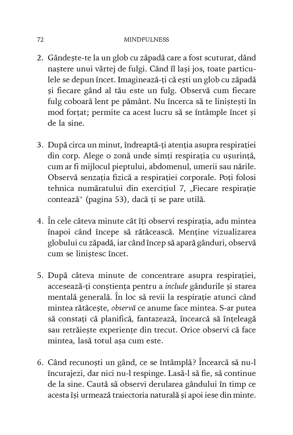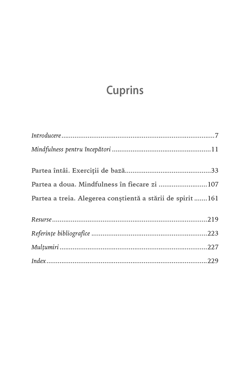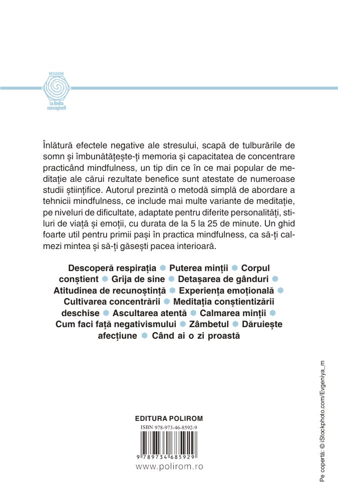 Înlătură efectele negative ale stresului, scapă de tulburările de somn și îmbunătățește-ți memoria și capacitatea de concentrare practicînd mindfulness, un tip din ce în ce mai popular de meditație ale cărui rezultate benefice sînt atestate de numeroase studii științifice. Autorul prezintă o metodă simplă de abordare a tehnicii mindfulness, ce include mai multe variante de meditație, pe niveluri de dificultate, adaptate pentru diferite personalități, stiluri de viață și emoții, cu durata de la 5 la 25 de minute. Un ghid foarte util pentru primii pași în practica mindfulness, ca să-ți calmezi mintea și să-ți găsești pacea interioară.