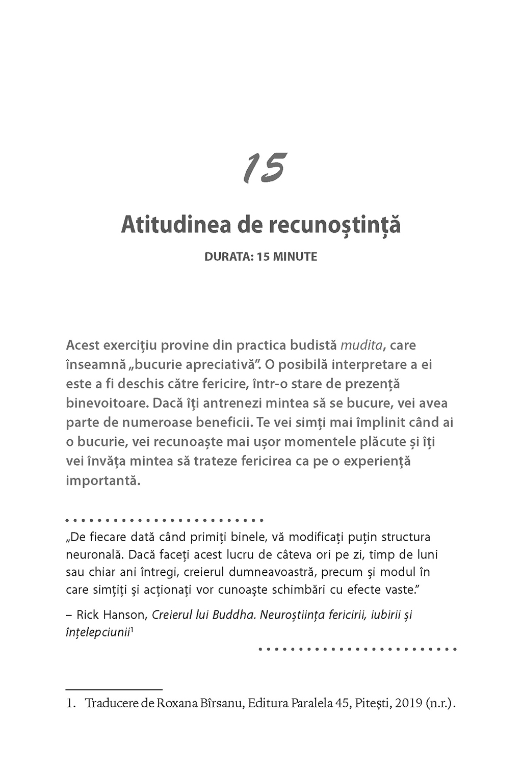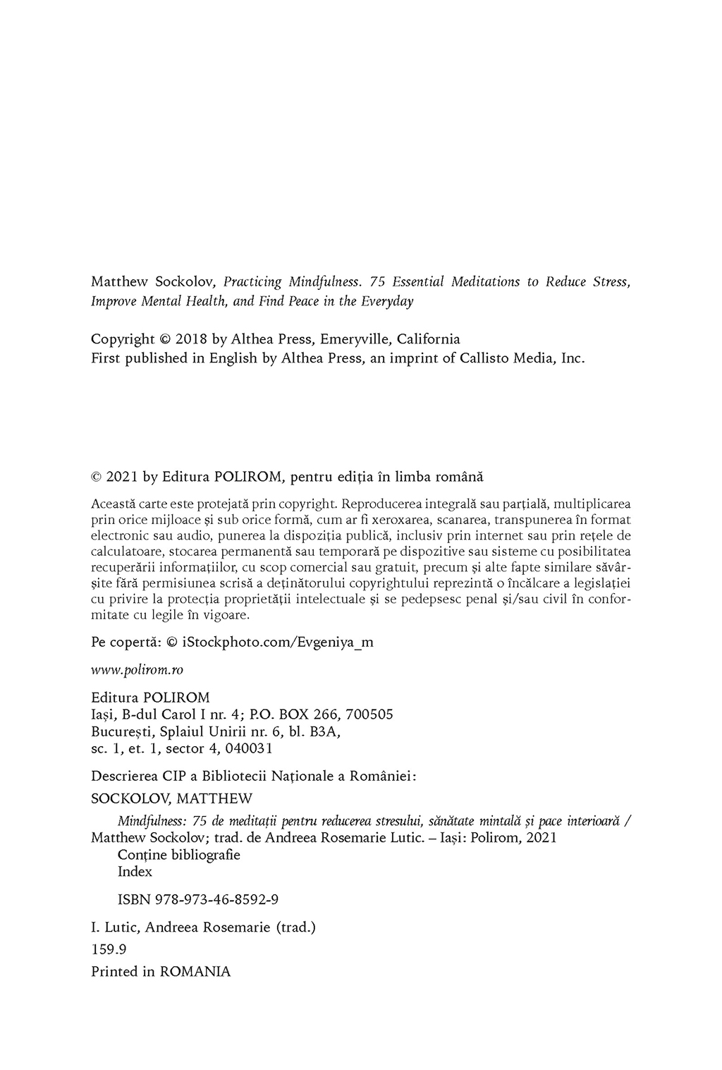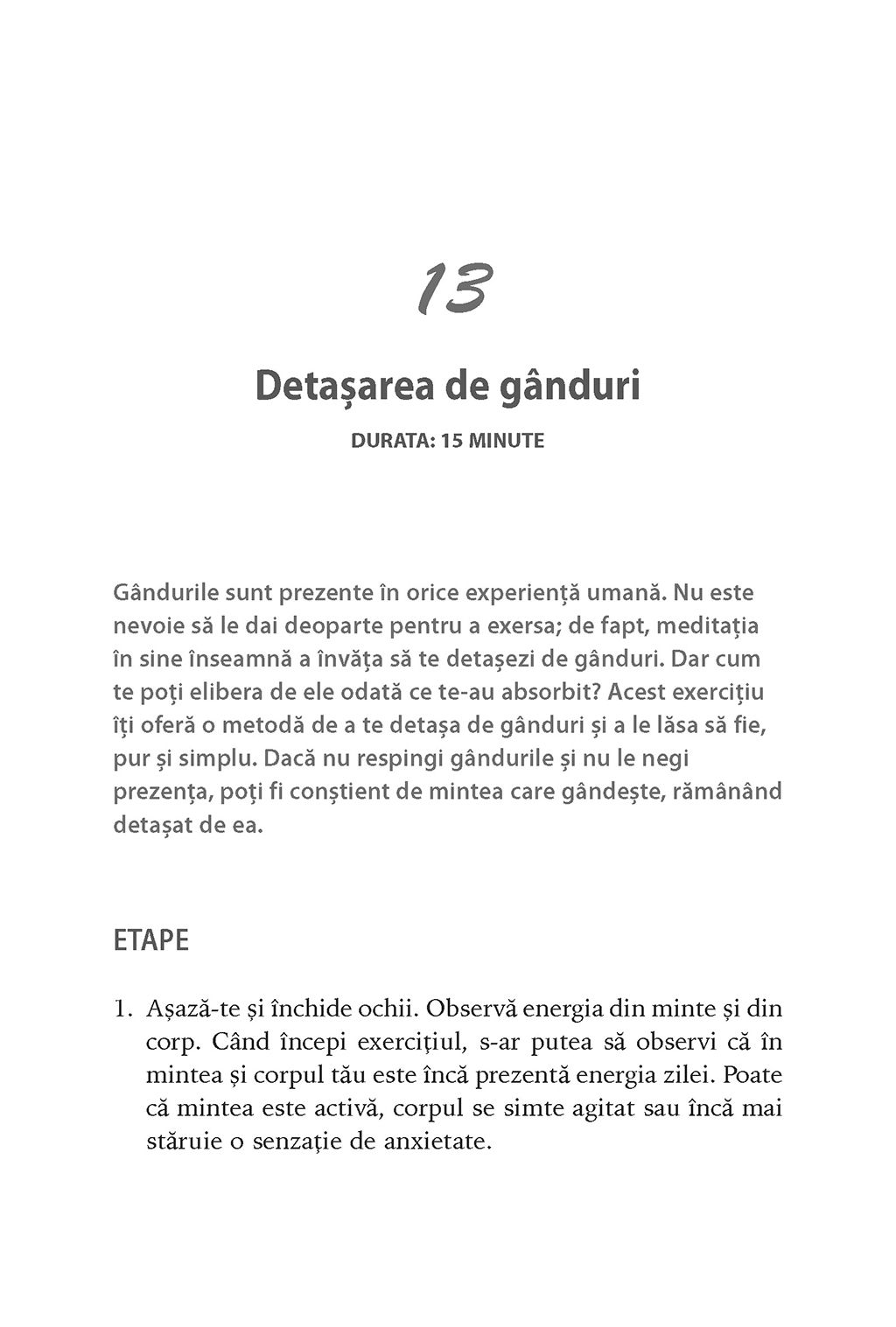 Înlătură efectele negative ale stresului, scapă de tulburările de somn și îmbunătățește-ți memoria și capacitatea de concentrare practicînd mindfulness, un tip din ce în ce mai popular de meditație ale cărui rezultate benefice sînt atestate de numeroase studii științifice. Autorul prezintă o metodă simplă de abordare a tehnicii mindfulness, ce include mai multe variante de meditație, pe niveluri de dificultate, adaptate pentru diferite personalități, stiluri de viață și emoții, cu durata de la 5 la 25 de minute. Un ghid foarte util pentru primii pași în practica mindfulness, ca să-ți calmezi mintea și să-ți găsești pacea interioară.