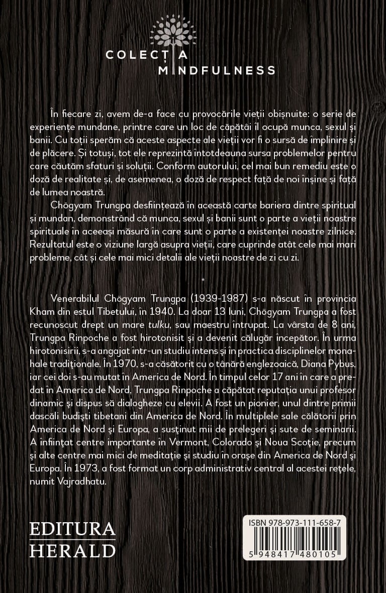 Chögyam Trungpa desfiinteaza in aceasta carte bariera dintre spiritual si mundan, demonstrand ca munca, sexul si banii sunt o parte a vietii noastre spirituale in aceeasi masura in care sunt o parte a existentei noastre zilnice. Rezultatul este o viziune larga asupra vietii, care cuprinde atat cele mai mari probleme, cat si cele mai mici detalii ale vietii noastre de zi cu zi.
