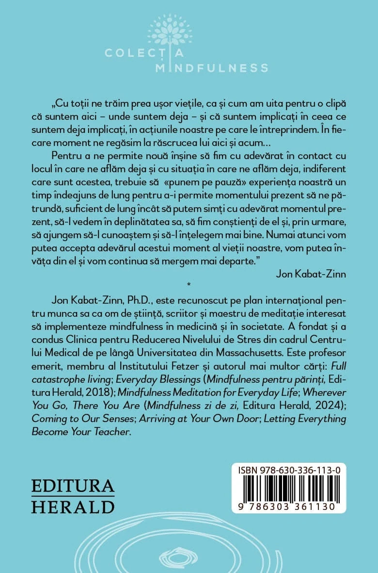 Mindfulness zi de zi reprezinta o introducere accesibila si practica in meditatia mindfulness si modul in care poate fi aplicata in viata de zi cu zi. Kabat-Zinn impartaseste experiente personale si explica cum meditatia poate fi folosita pentru a trai in prezent si a experimenta fiecare moment cu mai multa claritate si constienta.