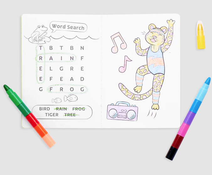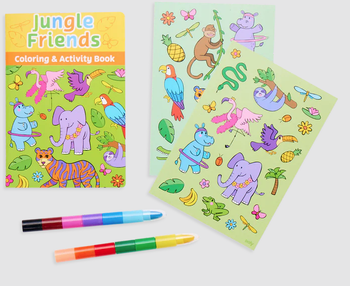 This jungle themed mini activity kit has everything you need to keep your little one from monkeying around when you’re on the go. Your tiny tiger can color and complete activities in the Jungle Friends Coloring and Activity Book using 1 of the 2 of the stackable crayons. These versatile crayons are great on the go with 6 fun colors stacked into one crayon shape. Decorate your pages (not siblings!) with totally wild stickers of your favorite jungle friends like tigers, sloths, and toucans. Suitable for ages 6 and up.