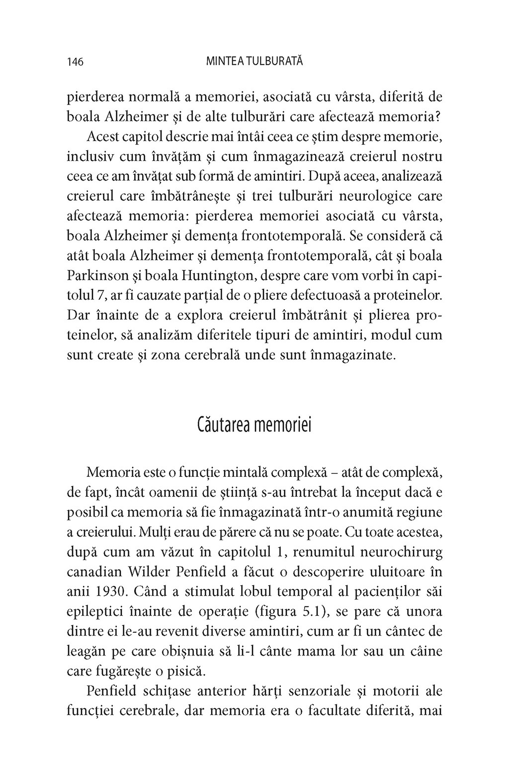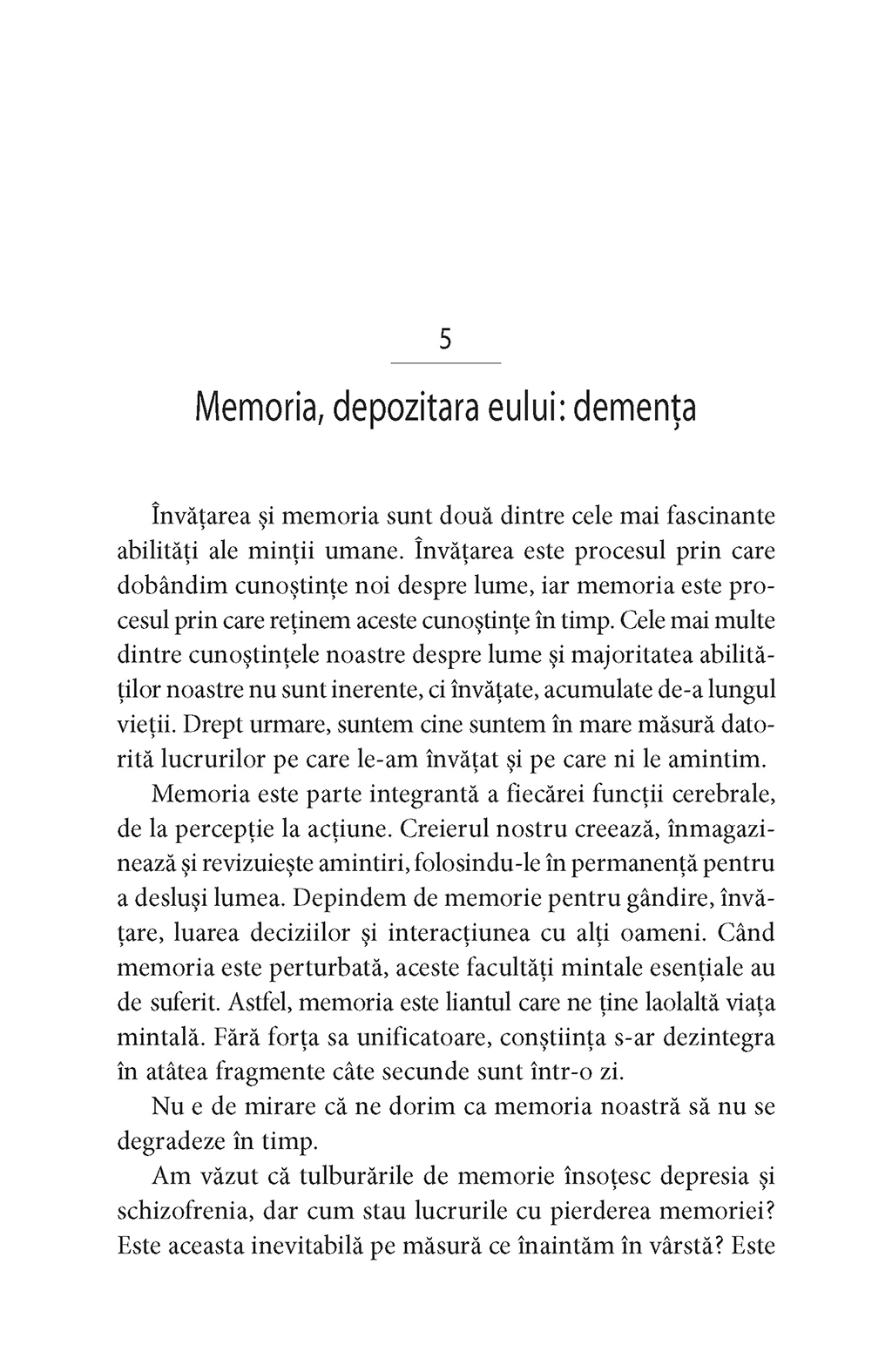 Eric R. Kandel, unul dintre cei mai importanţi specialişti în neuroştiinţe din lume, face o neobişnuită incursiune în universul enigmatic al creierului, arătînd ce ne dezvăluie tulburările mintale despre natura umană. Pe baza cercetărilor sale inovatoare şi a lucrărilor altor experţi, el încearcă să răspundă la una dintre cele mai dificile întrebări cu care ne confruntăm: cum apare mintea din materia fizică a creierului? Cei 86 de miliarde de neuroni cerebrali comunică între ei prin cele mai fine conexiuni, care ajung uneori să fie alterate sau chiar întrerupte. În felul acesta, procesele din creier care dau naştere minţii pot fi afectate, ducînd la tulburări precum autismul, depresia, schizofrenia, boala Parkinson sau tulburarea de stres posttraumatic. Studiul acestor afecţiuni şi explorarea potenţialelor lor tratamente ne pot ajuta să înţelegem mai bine felul în care creierul produce experienţele şi capacităţile noastre fundamentale – gîndurile, sentimentele, comportamentele, memoria şi creativitatea.