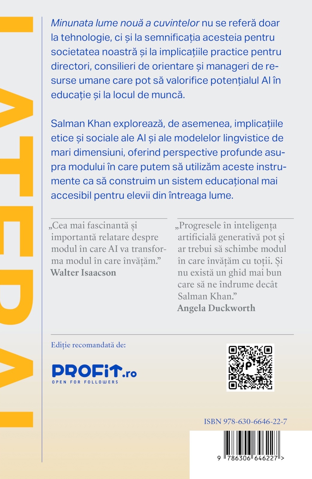 Pionier în domeniul tehnologiei educaționale, Khan examinează în detaliu aceste instrumente de ultimă generație și modul în care ele vor revoluționa felul în care învățăm și predăm. Khan subliniază că adoptarea AI în educație nu înseamnă înlocuirea interacțiunii umane, ci îmbunătățirea acesteia cu instrumente de învățare personalizate și accesibile, care încurajează abilitățile creative de rezolvare a problemelor și pregătirea elevilor pentru o lume din ce în ce mai digitalizată.