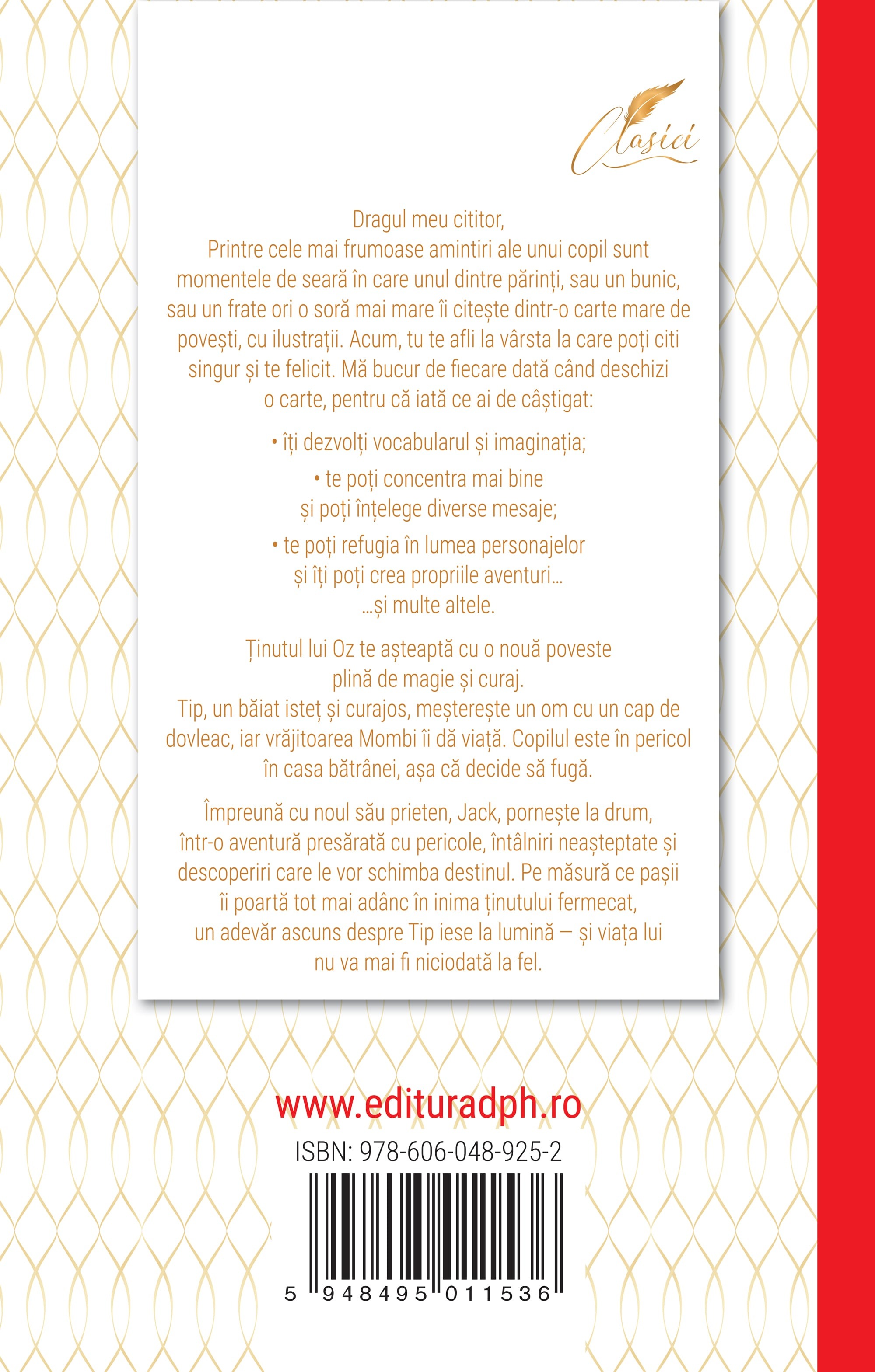 Povestea începe când Tip, un băiețel ținut prizonier de vrăjitoarea Mombi, reușește să evadeze cu ajutorul unei pulberi magice. Alături de personaje interesante - pe care le aduce la viață cu ajutorul aceleiași pulberi, Tip pornește astfel într-o călătorie spre Orașul de Smarald. Revin în filele povestirii și alte personaje îndrăgite și deja cunoscute - cum ar fi Sperie-Ciori sau Omul de Tinichea. Care este misiunea lor? Rămâne să aflați din paginile cărții.