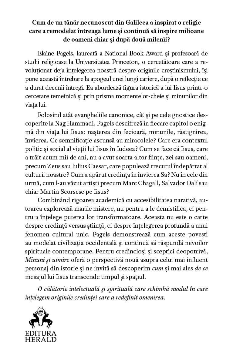 Minuni și uimire este o carte fascinantă despre viața lui Iisus, scrisă de renumita cercetătoare Elaine Pagels, laureată a National Book Award și una dintre cele mai importante voci în studiul creștinismului timpuriu. În această lucrare captivantă, autoarea explorează misterul istoric al modului în care un tânăr evreu sărac a inspirat apariția unei religii care avea să schimbe lumea.
