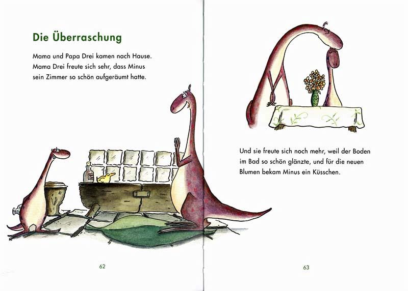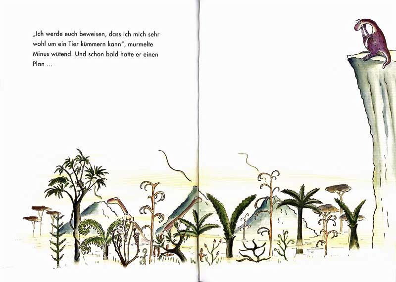 Dinosaurier Minus wünscht sich ein Haustier. Sogar mit einem Urfisch wäre er zufrieden! Doch seine Eltern glauben nicht, dass er sich schon allein um ein Tier kümmern kann. »Ich werde es euch beweisen!«, ruft Minus trotzig und hat schon einen Plan: Auf Plakaten bietet er Haustierbetreuung an. Schnell steht Kundschaft vor der Tür: T. Rex soll gebadet werden, Triceratops »Topsi« braucht Auslauf und Stegosaurus »Stigi« Krallenpflege.