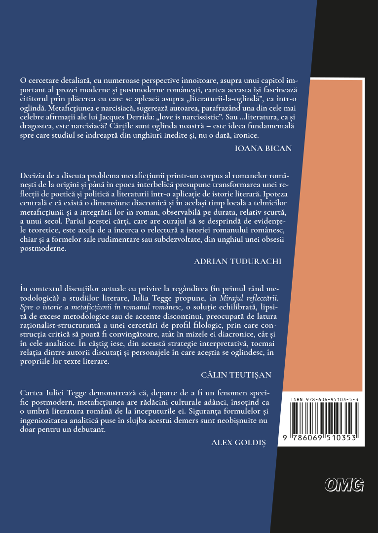 O cercetare detaliată, cu numeroase perspective înnoitoare, asupra unui capitol important al prozei moderne și postmoderne românești, cartea aceasta își fascinează cititorul prin plăcerea cu care se apleacă asupra ”literaturii-la-oglindă”, ca într-o oglindă. Metaficțiunea e narcisiacă, sugerează autoarea, parafrazând una dintre cele mai celebre afirmații ale lui Jacques Derrida: ”love is narcissistic”. Sau...literatura, ca și dragostea, este narcisiacă? Cărțile sunt oglinda noastră - este ideea fundamentală spre care studiul se îndreaptă din unghiuri inedite și, nu o dată, ironice.