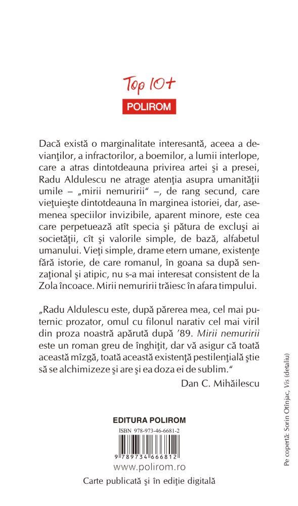 Dacă există o marginalitate interesantă, aceea a devianţilor, a infractorilor, a boemilor, a lumii interlope, care a atras dintotdeauna privirea artei şi a presei, Radu Aldulescu ne atrage atenţia asupra umanităţii umile – „mirii nemuririi” –, de rang secund, care vieţuieşte dintotdeauna în marginea istoriei, dar, ase-menea speciilor invizibile, aparent minore, este cea care perpetuează atît specia şi pătura de excluşi ai societăţii, cît şi valorile simple, de bază, alfabetul umanului. Vieţi simple, drame etern umane, existenţe fără istorie, de care romanul, în goana sa după senzaţional şi atipic, nu s-a mai interesat consistent de la Zola încoace. Mirii nemuririi trăiesc în afara timpului.