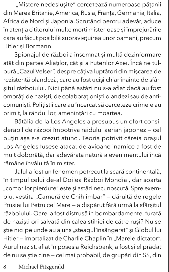 Acest documentar fascinant acopera, printre altele, batalia de la Los Angeles, in timpul careia pilotii americani au crezut ca le trecusera prin fata ochilor avioane inamice japoneze; moartea misterioasa a muzicianului Glenn Miller; barbatul care nu a existat, cadavrul imbracat in haina militara, cu toate documentele (false) la el, parand ca scoate la vedere planurile Aliatilor pentru invadarea Greciei si a Sardiniei; disparitia Camerei de Chihlimbar; comorile pierdute ale nazistilor, inclusiv ,,steagul insangerat" si aurul lui Rommel; blestemul mormantului lui Timur Lenk; ghicitoarea lui Rudolf Hess, ca sa enumeram doar cateva.