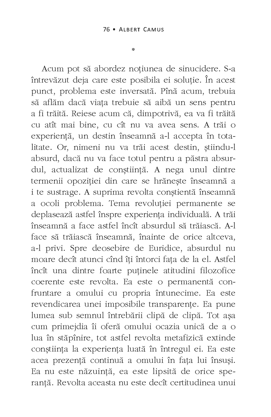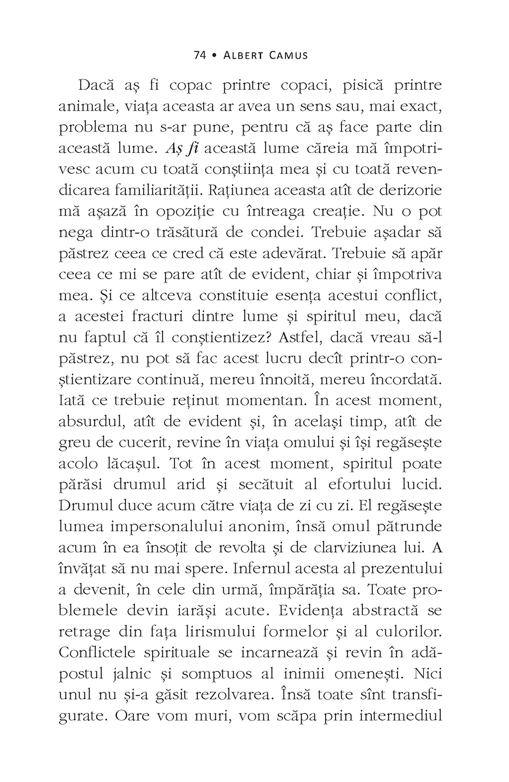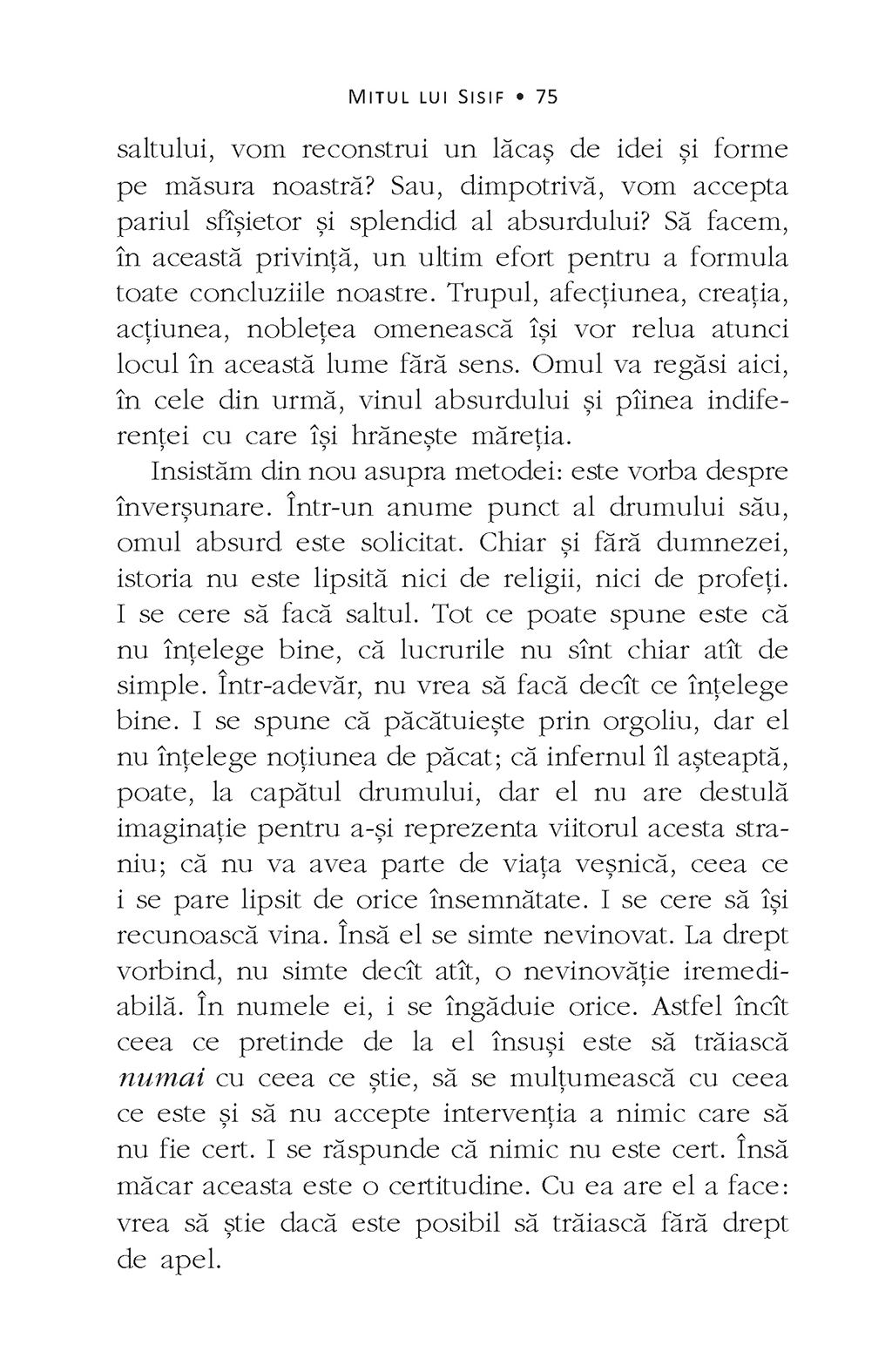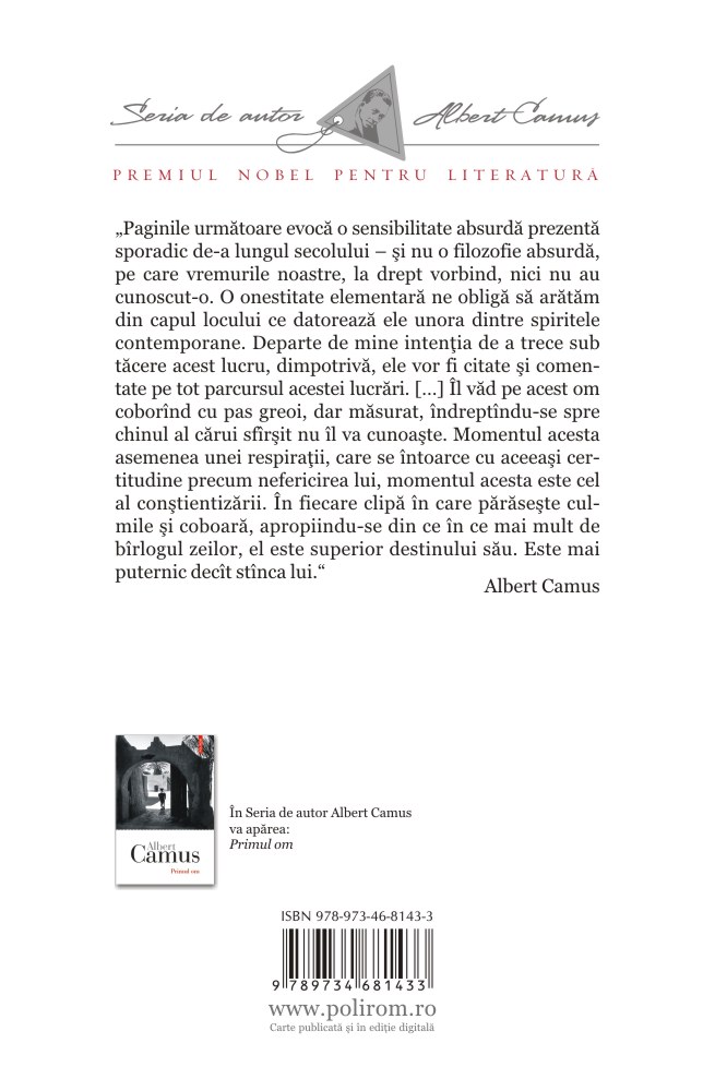 „Paginile următoare evocă o sensibilitate absurdă prezentă sporadic de-a lungul secolului – şi nu o filozofie absurdă, pe care vremurile noastre, la drept vorbind, nici nu au cunoscut-o. O onestitate elementară ne obligă să arătăm din capul locului ce datorează ele unora dintre spiritele contemporane. Departe de mine intenţia de a trece sub tăcere acest lucru, dimpotrivă, ele vor fi citate şi comentate pe tot parcursul acestei lucrări. […] Îl văd pe acest om coborînd cu pas greoi, dar măsurat, îndreptîndu-se spre chinul al cărui sfîrşit nu îl va cunoaşte. Momentul acesta asemenea unei respiraţii, care se întoarce cu aceeaşi certitudine precum nefericirea lui, momentul acesta este cel al conştientizării. În fiecare clipă în care părăseşte culmile şi coboară, apropiindu-se din ce în ce mai mult de bîrlogul zeilor, el este superior destinului său. Este mai puternic decît stînca lui.” (Albert Camus)