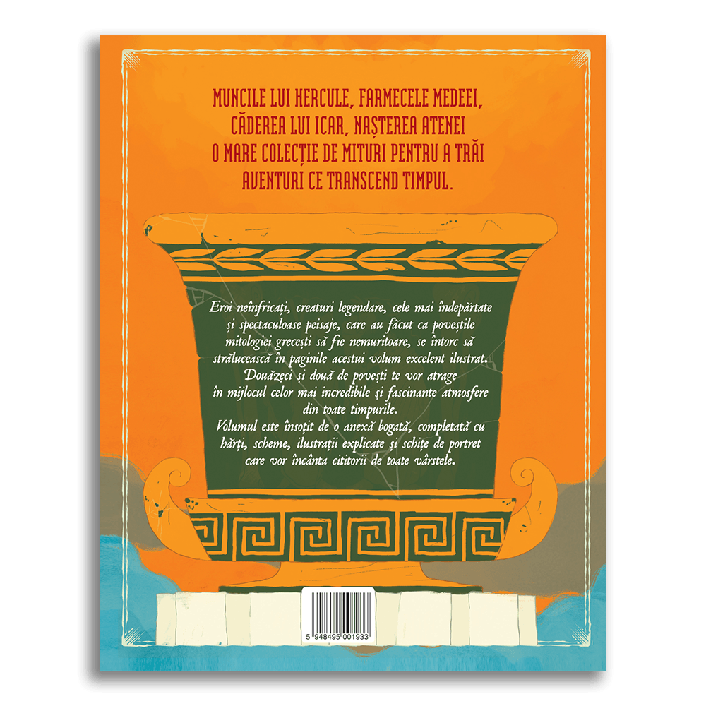 Eroi neînfricați, creaturi legendare, cele mai îndepărtate și spectaculoase peisaje, care au făcut ca poveștile mitologiei grecești să fie nemuritoare, se întorc să strălucească în paginile acestui volum excelent ilustrat. Douăzeci și două de povești te vor atrage în mijlocul celor mai incredibile și fascinante atmosfere din toate timpurile. Volumul este însoțit de o anexă bogată, completată cu hărți, scheme, ilustrații explicate și schițe de portret care vor încânta cititorii de toate vârstele.