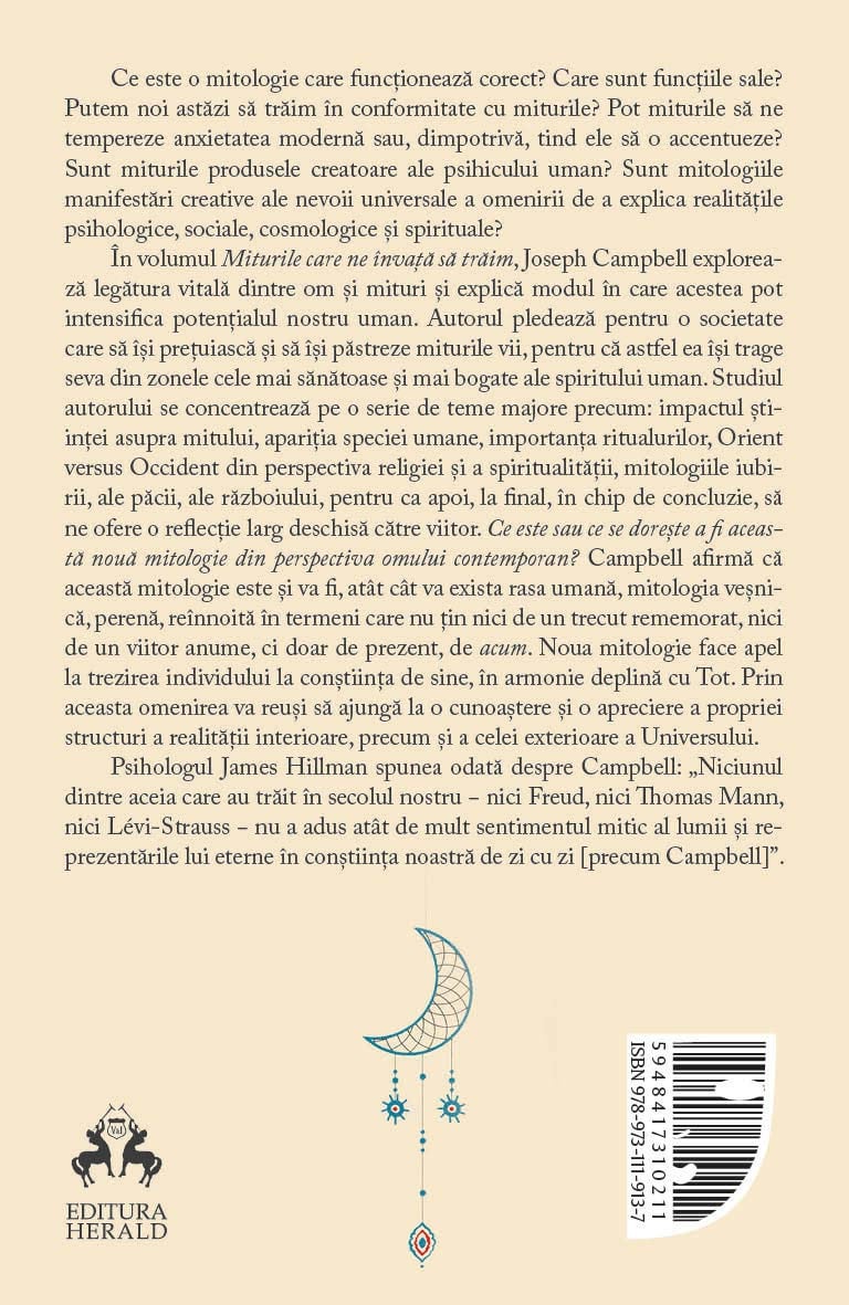 In volumul Miturile care ne invata sa traim, Joseph Campbell exploreaza legatura vitala dintre om si mituri si explica modul in care acestea pot intensifica potentialul nostru uman. Autorul pledeaza pentru o societate care sa isi pretuiasca si sa isi pastreze miturile vii, pentru ca astfel ea isi trage seva din zonele cele mai sanatoase si mai bogate ale spiritului uman. Studiul autorului se concentreaza pe o serie de teme majore precum: impactul stiintei asupra mitului, aparitia speciei umane, importanta ritualurilor, Orient versus Occident din perspectiva religiei si a spiritualitatii, mitologiile iubirii, ale pacii, ale razboiului, pentru ca apoi, la final, in chip de concluzie, sa ne ofere o reflectie larg deschisa catre viitor. Ce este sau ce se doreste a fi aceasta noua mitologie din perspectiva omului contemporan? Campbell afirma ca aceasta mitologie este si va fi, atat cat va exista rasa umana, mitologia vesnica, perena, reinnoita in termeni care nu tin nici de un trecut rememorat, nici de un viitor anume, ci doar de prezent, de acum. Noua mitologie face apel la trezirea individului la constiinta de sine, in armonie deplina cu Tot. Prin aceasta omenirea va reusi sa ajunga la o cunoastere si o apreciere a propriei structuri a realitatii interioare, precum si a celei exterioare a Universului.