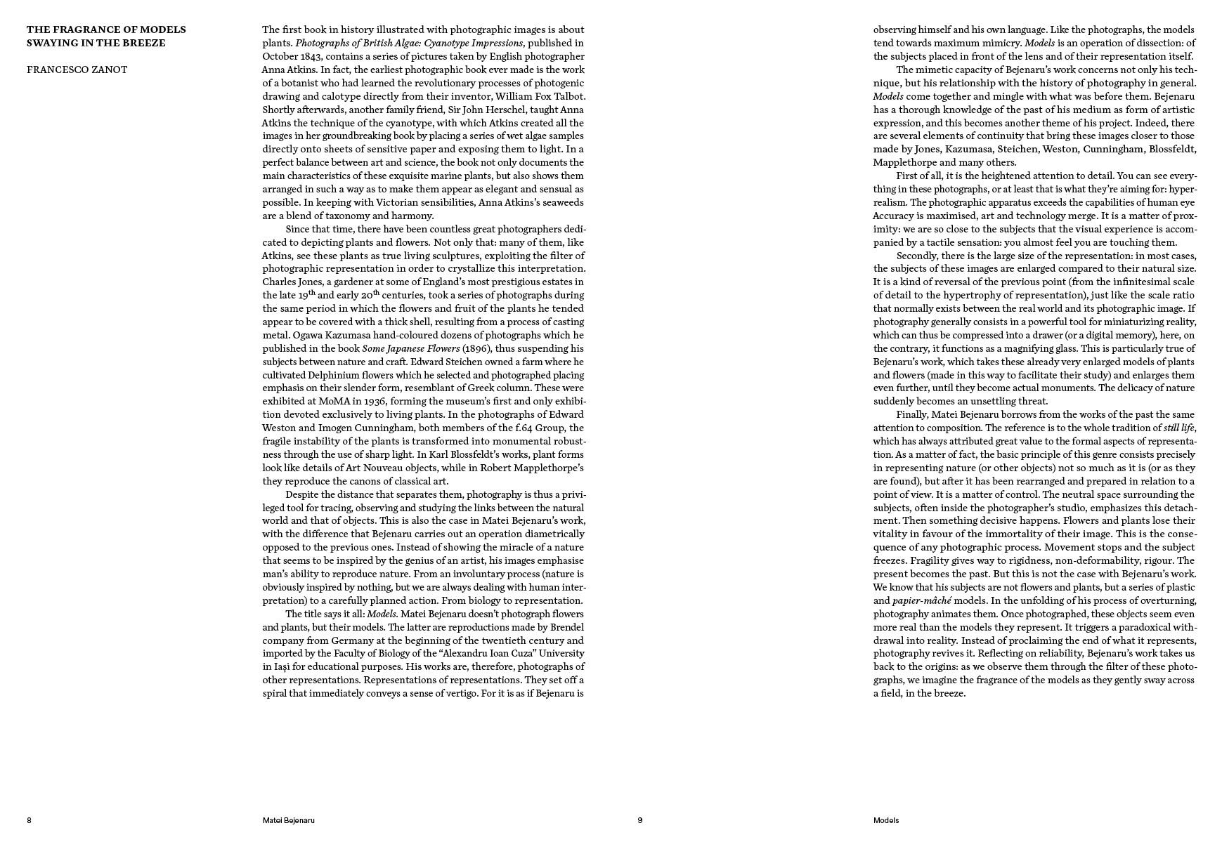” Models - Matei Bejenaru” re/prezintă în format editorial proiectul fotografic omonim care pornește, ca subiect, de la colecția de modele de plante de la Facultatea de Biologie de la Universitatea „Alexandru Ioan Cuza” din Iași. Majoritatea dintre ele au fost realizate de firma germană Brendel la sfârșitul secolului al XIX-lea și în prima jumătate a scolului XX și au fost achiziționate de Universitatea din Iași în perioada interbelică. Modele Brendel au fost folosite cu scopuri didactice și, în prezent, se regăsesc în mai multe colecții în muzee și instituții de învățământ din Europa. Pe deoparte, fotografiile analizează raportul dintre imaginea reprezentată și reprezentările realității și, pe de alta, expresivitatea și frumusețea formelor și structurilor lumii vegetale în fotografii supradimensionate. Funcția principală pentru care au fost realizate a fost didactică, însă, odată cu trecerea timpului, ele au câștigat și o semnificație culturală, de instrumente de cunoaștere rațională a realității.