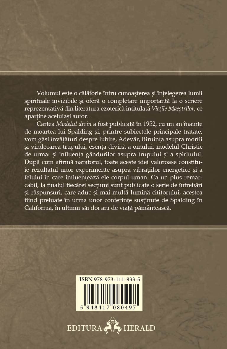 Modelul divin (The Last Words), carte publicata spre sfarsitul vietii lui Baird Spalding, este continuarea fireasca a lucrarii lui reprezentative, Vietile Maestrilor, aparuta, de asemenea, la Editura Herald. Putini scriitori au starnit un interes atat de mare precum Baird T. Spalding, al carui nume a intrat in legenda atat in cercurile cautatorilor de adevar, cat si in metafizica primei jumatati a secolului XX. Putini sunt scriitorii care au atins un grad de inspiratie spirituala atat de inalt precum Spalding. Firea acestui om, felul in care i-a fost revelat mesajul (pe care urma sa-l raspandeasca in lume) si Mesajul in sine fac dovada vie a adevarului vorbelor sale, a cinstei si a sinceritatii autorului.