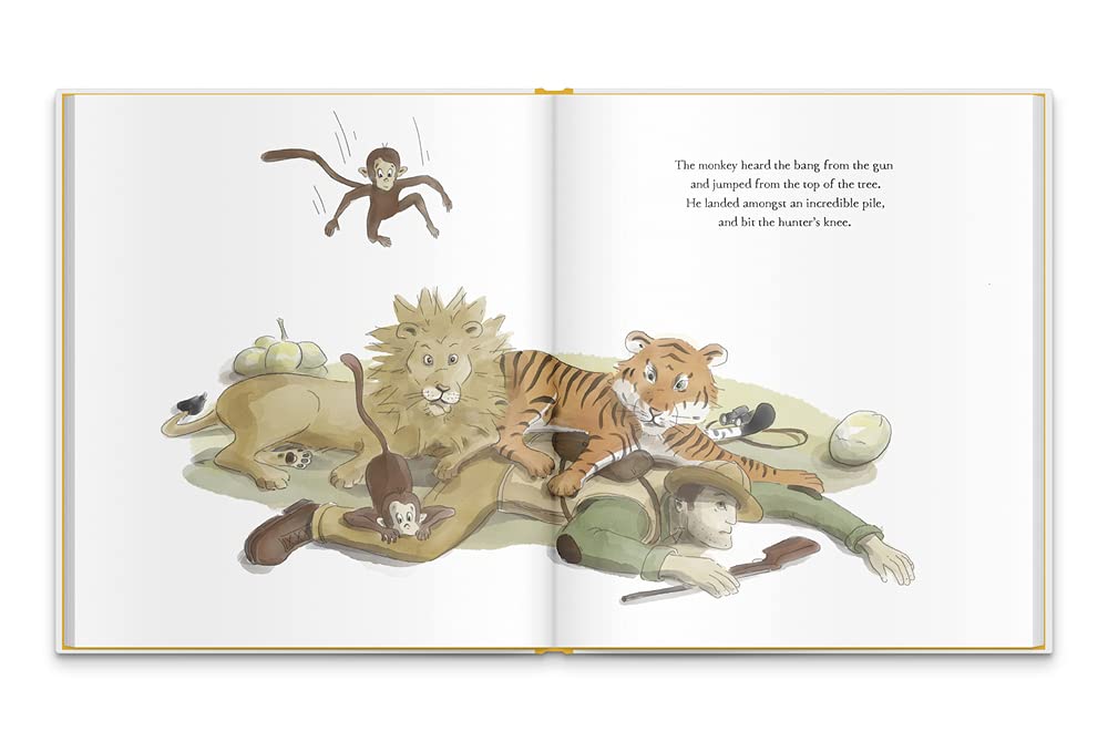 Monkey Crush introduces human hunting and so allows parents to talk about the reason people hunt. Is it for food or pleasure? The scene is set in India where lions and tigers still exist together. The story brings coconuts to life and shows how an unexpected lunch can save animals from being eaten or hunted.
