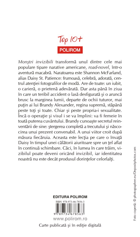 Monştri invizibili transformă unul dintre cele mai populare tipare narative americane, road-novel, într-o aventură macabră. Naratoarea este Shannon McFarland, alias Daisy St. Patience: frumoasă, celebră, adorată, centrul atenţiei fotografilor de modă. Are de toate: un iubit, o carieră, o prietenă adevărată. Dar asta pînă în ziua în care un teribil accident o lasă desfigurată şi o aruncă brusc la marginea lumii, departe de ochii tuturor, mai puţin ai lui Brandy Alexander, regina supremă, stăpînă peste toţi şi toate. Chiar şi peste propria-i sexualitate. Încă o operaţie şi visul i se va împlini: va fi femeie în toată puterea cuvîntului. Brandy cunoaşte secretul reinventării de sine: ştergerea completă a trecutului şi născocirea unui prezent convenabil. A unui viitor croit după măsura fiecăruia. Aceasta este lecţia pe care o învaţă Daisy în timpul unei călătorii încurcate spre un ţel aflat în continuă schimbare. Căci, în lumea în care trăim, vizibilul poate deveni oricînd invizibil, iar identitatea noastră nu este decît produsul dorinţelor celorlalţi.