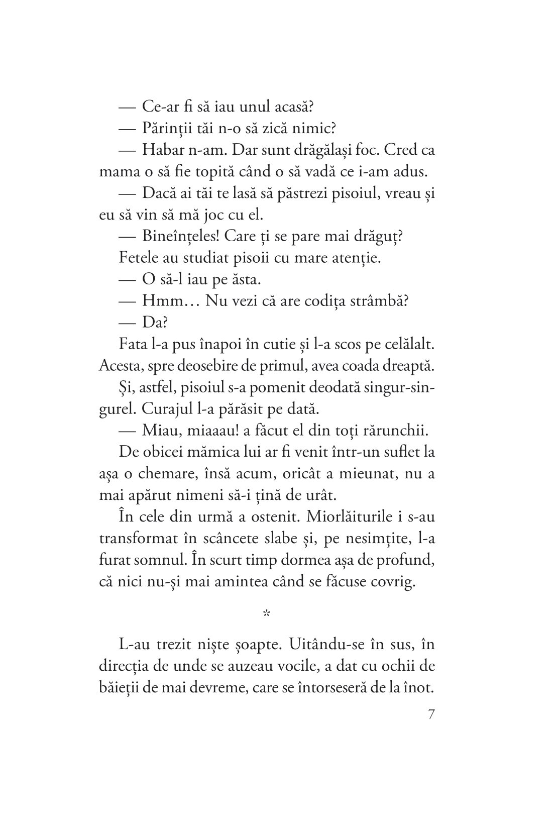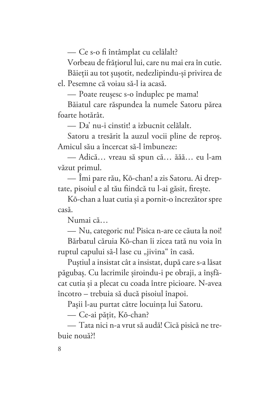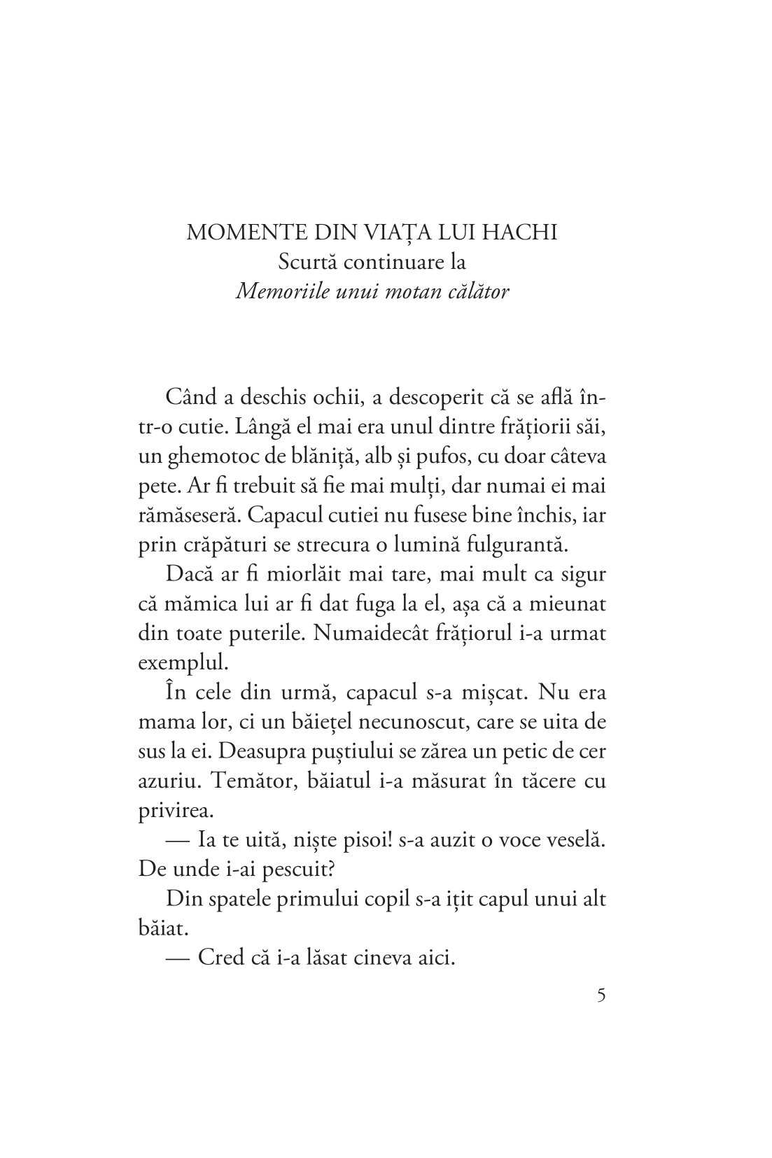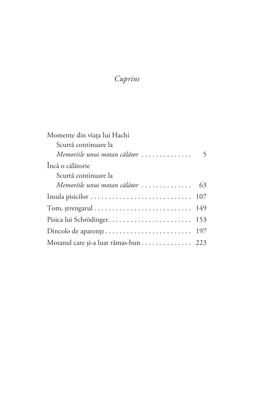 După succesul romanului Memoriile unui motan călător, un adevărat fenomen internațional, vândut în peste 1 000 000 de exemplare, Hiro Arikawa revine cu șapte povestiri despre șapte pisici și stăpânii lor: șapte întâmplări pline de empatie, înțelepciune și gingășie despre provocările mai mari și mai mici de zi cu zi, despre frumusețea schimbării și legătura vindecătoare dintre feline și oameni.