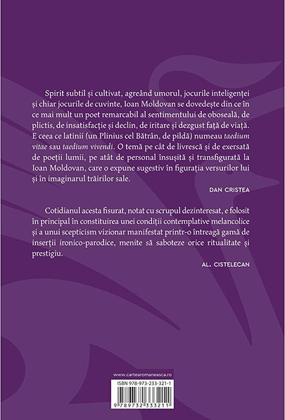 Spirit subtil și cultivat, agreând umorul, jocurile inteligenței și chiar jocurile de cuvinte, Ioan Moldovan se dovedește din ce în ce mai mult un poet remarcabil al sentimentului de oboseală, de plictis, de insatisfacție și declin, de iritare și dezgust față de viață. E ceea ce latinii (un Plinius cel Bătrân, de pildă) numeau taedium vitae sau taedium vivendi. O temă pe cât de livrescă și de exersată de poeții lumii, pe atât de personal însușită și transfigurată la Ioan Moldovan, care o expune sugestiv în figurația versurilor lui și în imaginarul trăirilor sale. - Dan Cristea