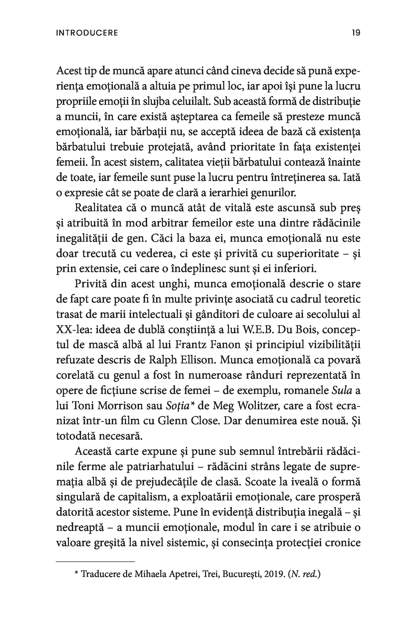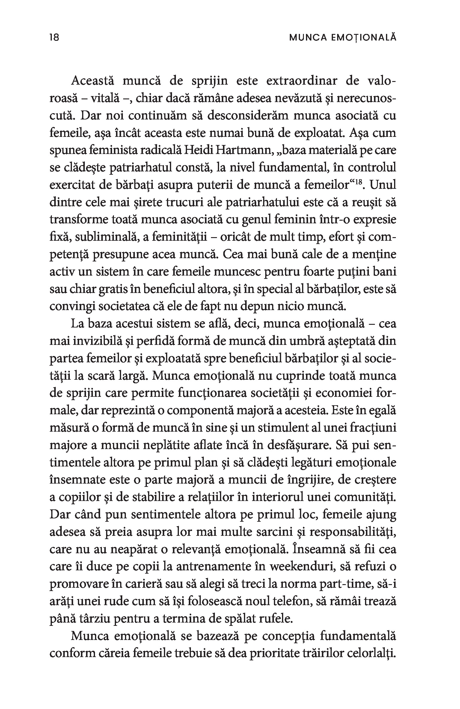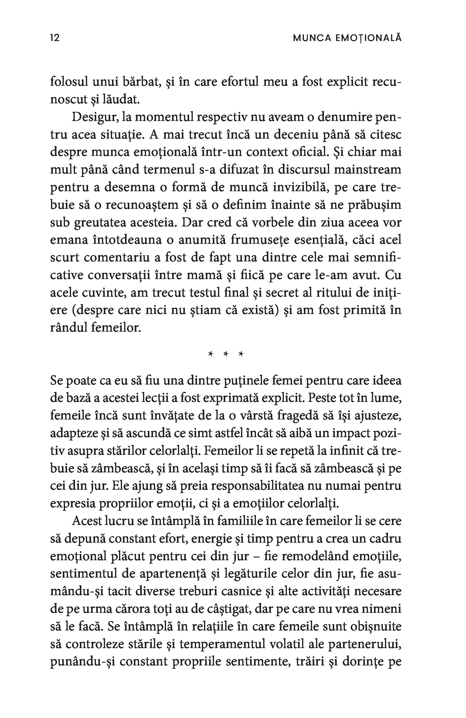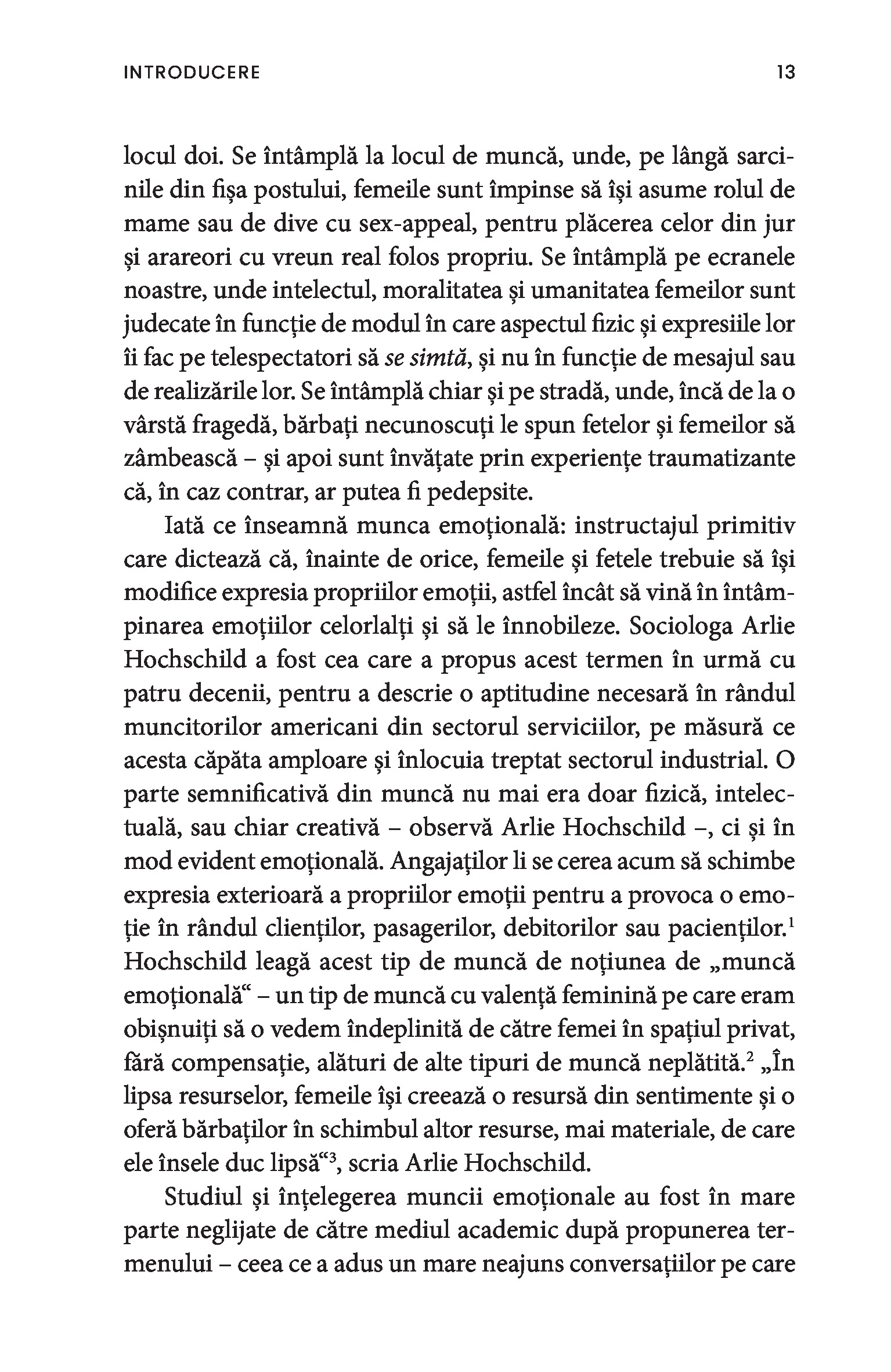 O bonă, o infirmieră, până și câștigătoarea unui concurs de frumusețe sunt toate nevoite să depună muncă emoțională. Chiar și într-un context profesional, obligația de a-i servi pe ceilalți impune adoptarea ipostazei epuizante de mamă, sau de soră împăciuitoare, sau de divă sexy și limitează drastic posibila exprimare a sinelui autentic. Paradoxul muncii emoționale este că percepția asupra capacităților femeilor este profund devalorizantă, ceea ce susține în continuare patriarhatul și duce la desconsiderarea muncii prestate de acestea.