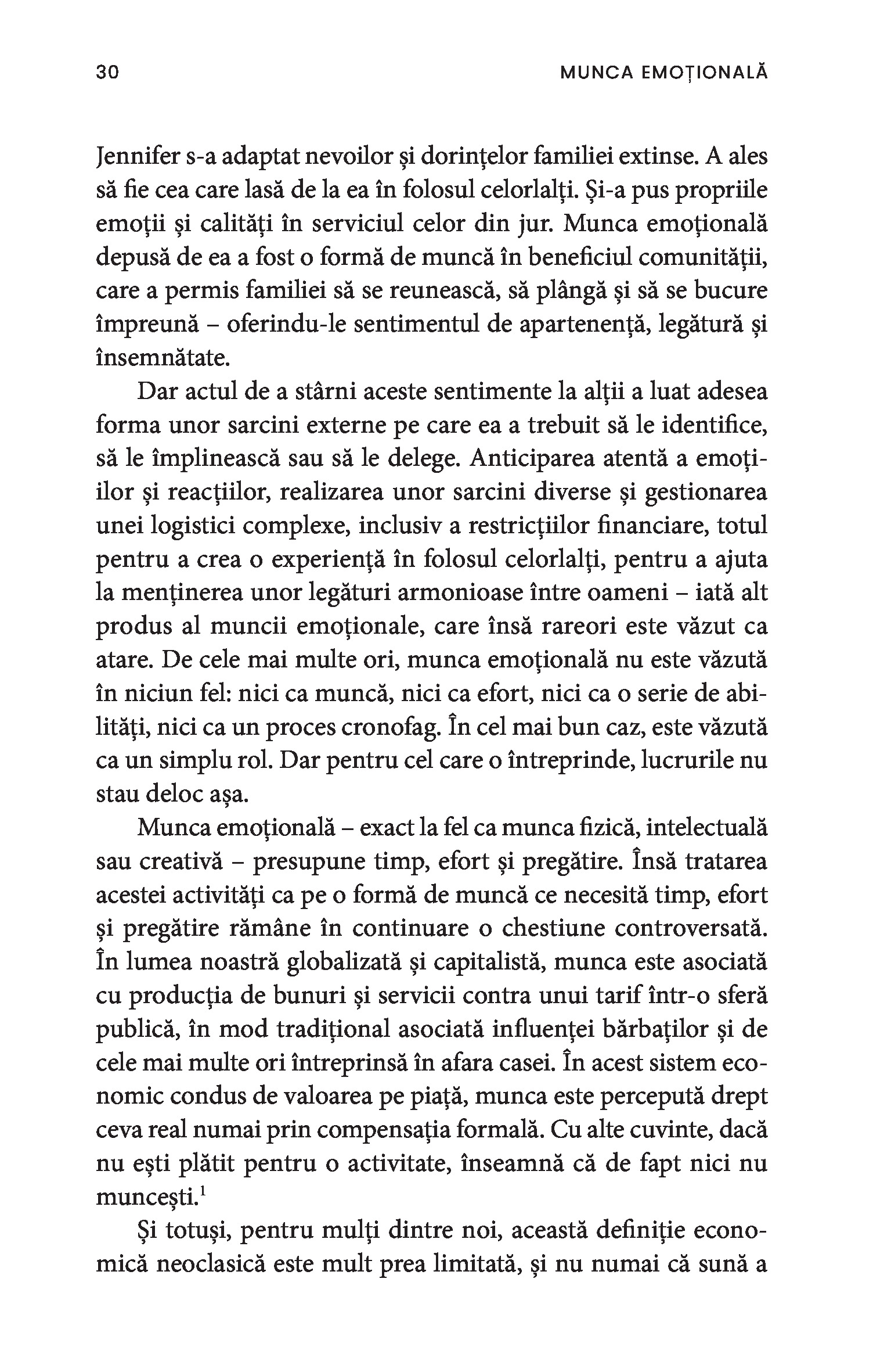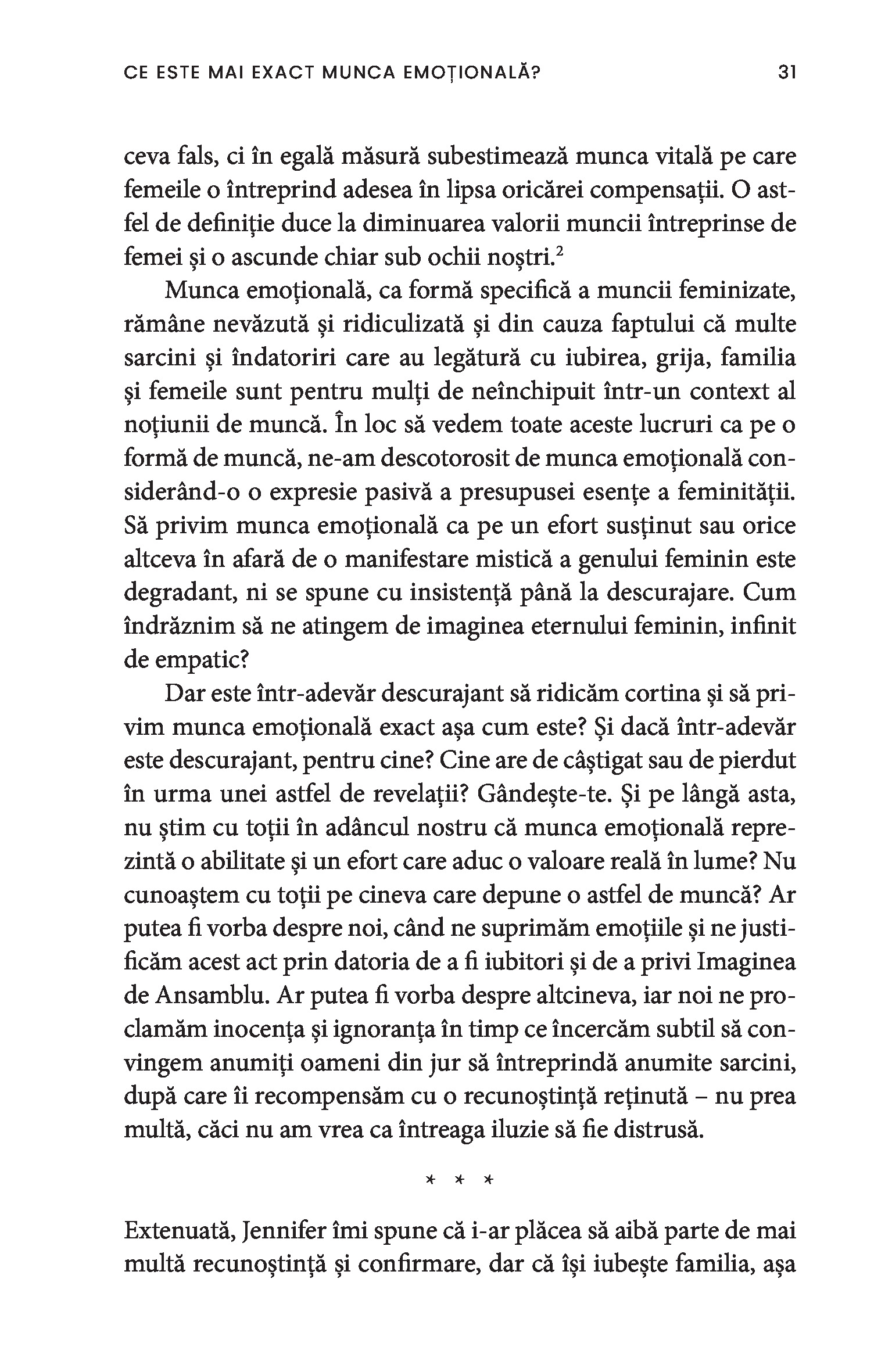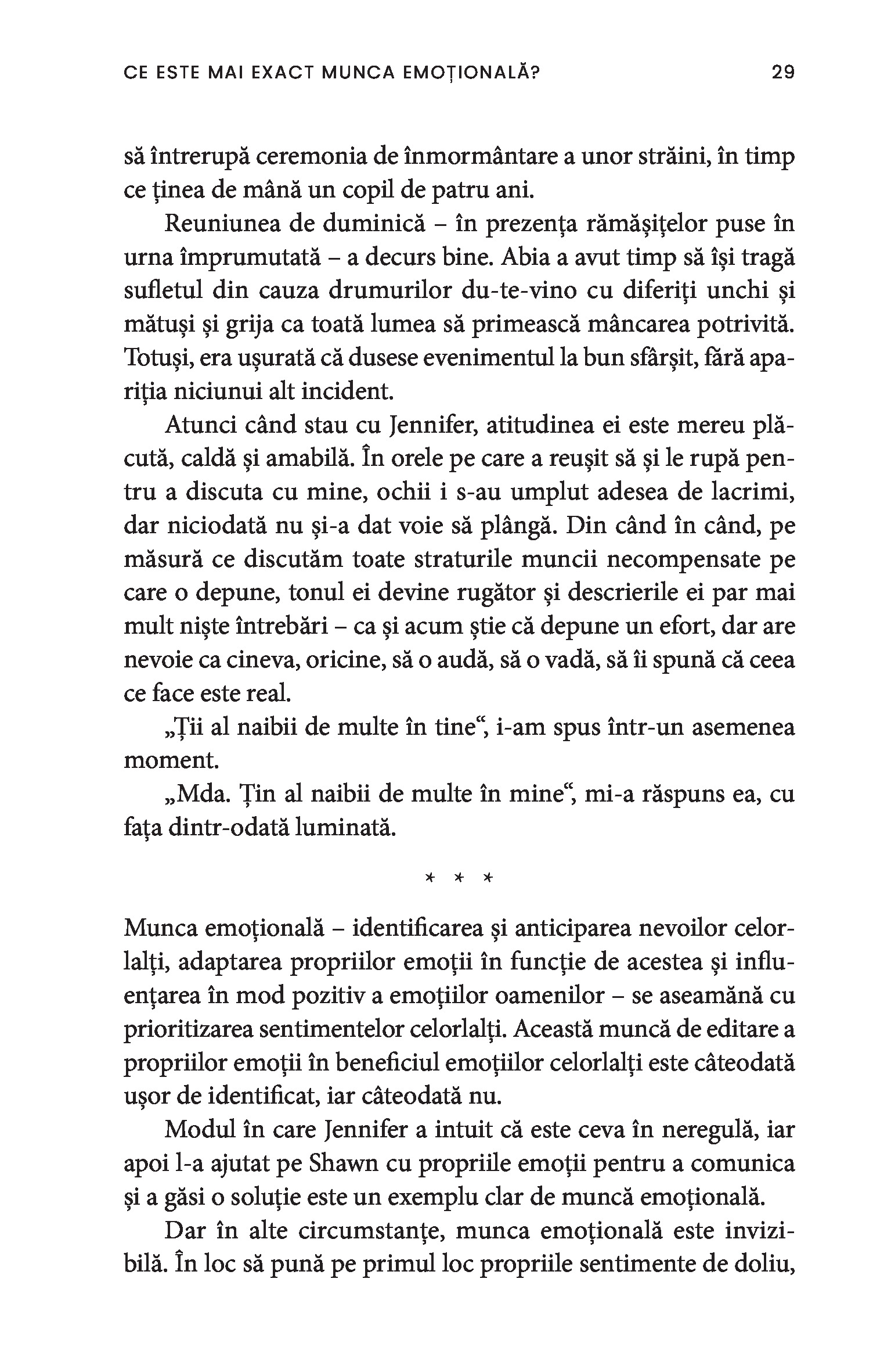 O bonă, o infirmieră, până și câștigătoarea unui concurs de frumusețe sunt toate nevoite să depună muncă emoțională. Chiar și într-un context profesional, obligația de a-i servi pe ceilalți impune adoptarea ipostazei epuizante de mamă, sau de soră împăciuitoare, sau de divă sexy și limitează drastic posibila exprimare a sinelui autentic. Paradoxul muncii emoționale este că percepția asupra capacităților femeilor este profund devalorizantă, ceea ce susține în continuare patriarhatul și duce la desconsiderarea muncii prestate de acestea.