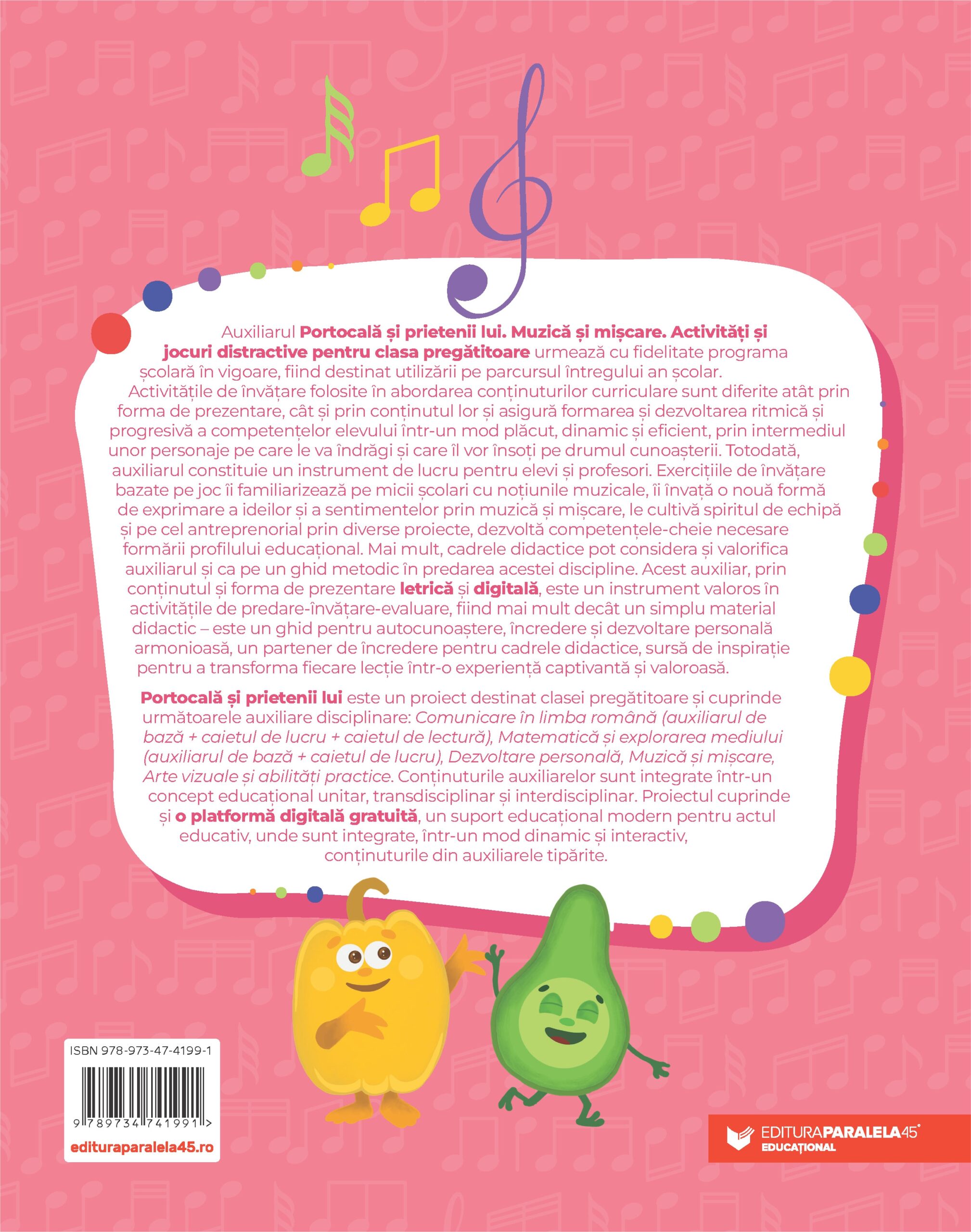 Auxiliarul Portocală și prietenii lui. Muzică și mișcare. Activități și jocuri distractive pentru clasa pregătitoare urmează cu fidelitate programa școlară în vigoare, fiind destinat utilizării pe parcursul întregului an școlar.