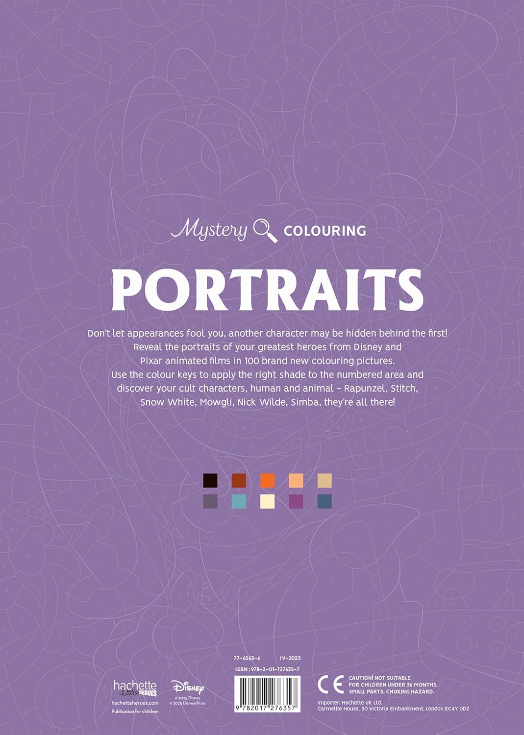 Discover the portraits of the greatest heroes from Disney and Pixar animated films in 100 brand new grids. Follow the colour codes, colour in the numbered boxes and spotlight cult characters. Rapunzel, Stitch, Snow White, Mowgli, Nick Wilde, Simba... human or animal, they're all there!