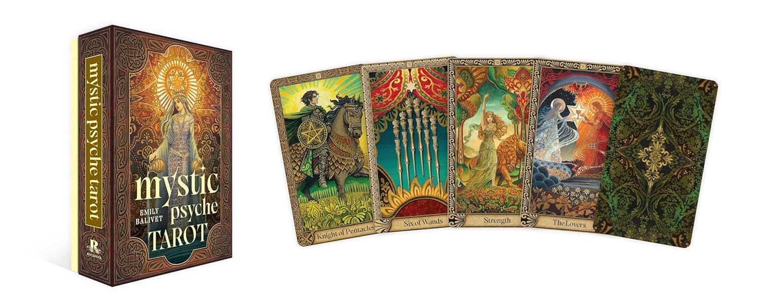 Discover the Mystic Psyche Tarot, a beautifully crafted 78-card deck that merges timeless wisdom with contemporary insight. Designed for both beginners and seasoned readers, this divinatory tool explores the depths of the human experience through vibrant, mythological, and psychedelic art by Emily Balivet. Using Celtic, surreal and Art Nouveau artwork, each card is a portal to universal archetypes through dynamic, otherworldly visions that offer intuitive guidance and spiritual self-discovery. Rooted in esoteric traditions, this deck bridges tarot, alchemy, and pagan lore, inviting you to navigate life's cycles and unlock transformative truths. Let the magic of Emily Balivet's art guide you on a journey of self-discovery and spiritual insight.
