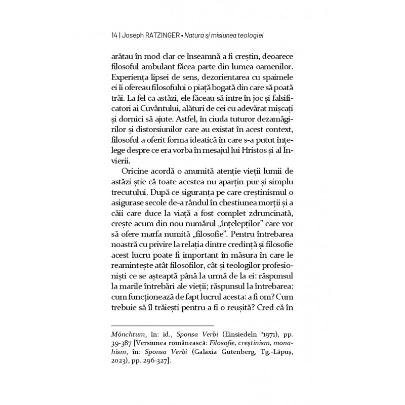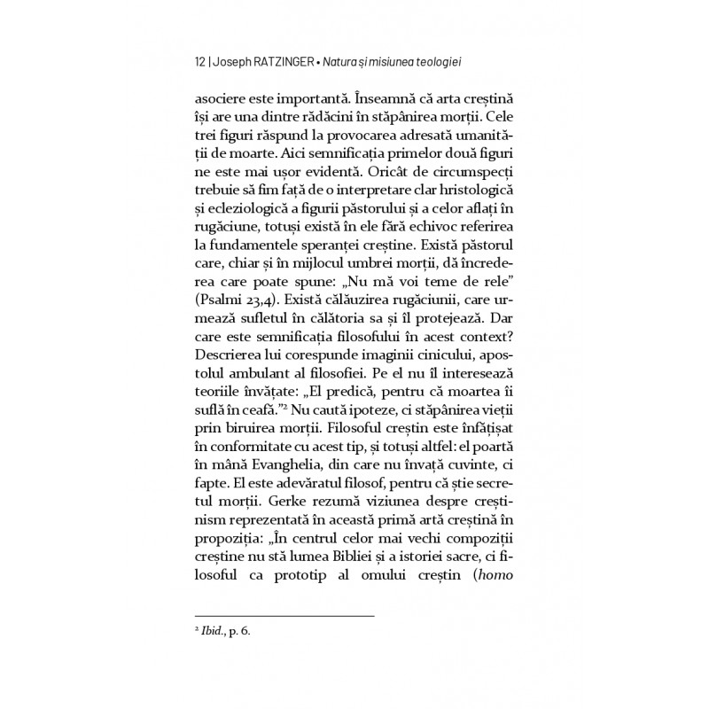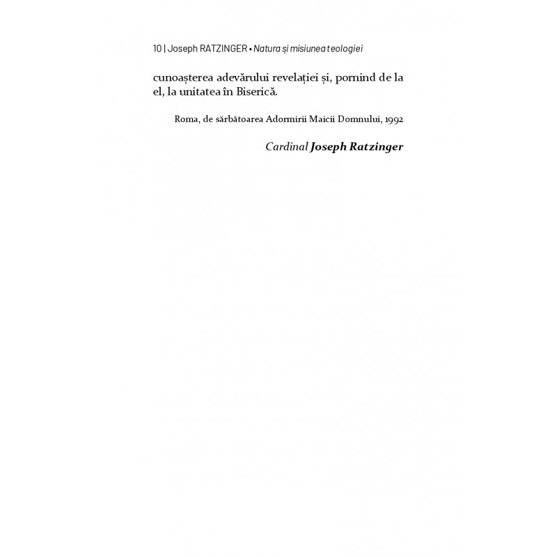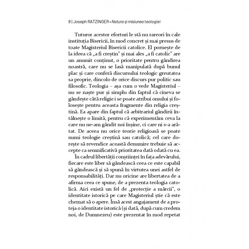 În această lucrare remarcabilă, „Natura și misiunea teologiei", cardinalul Joseph Ratzinger ne conduce într-o călătorie intelectuală prin esența și misiunea teologiei creștine. Cu o claritate excepțională și o profunzime spirituală impresionantă, autorul explorează teme cruciale pentru credința creștină contemporană, oferind o perspectivă unică asupra relației dintre teologie și misiunea Bisericii în lumea modernă.