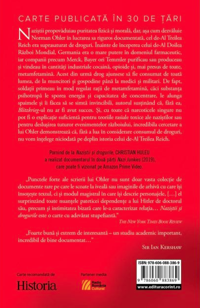 Naziștii propovăduiau puritatea fizică și morală, dar, așa cum dezvăluie Norman Ohler în lucrarea sa riguros documentată, cel de-Al Treilea Reich era suprasaturat de droguri. Înainte de începerea celui de-Al Doilea Război Mondial, Germania era o mare putere în domeniul farmaceutic, iar companii precum Merck, Bayer ori Temmler purificau sau produceau și vindeau în cantități industriale cocaină, opioide și, mai presus de toate, metamfetamină. Acest din urmă drog ajunsese să fie consumat de toată lumea, de la muncitori și gospodine până la medici și militari. De fapt, soldații primeau în mod regulat rații de metamfetamină, căci substanța psihotropă le sporea energia și capacitatea de concentrare, le alunga spaimele și îi făcea să se simtă invincibili, autorul susținând că, fără ea, Blitzkrieg-ul nu ar fi avut succes. Și, cu toate că narcoticele singure nu pot fi o explicație suficientă pentru teoriile rasiale toxice al naziștilor sau pentru deslușirea tuturor evenimentelor războiului, incredibila cercetare a lui Ohler demonstrează că, fără a lua în considerare consumul de droguri, nu vom înțelege niciodată pe deplin istoria celui de-Al Treilea Reich.