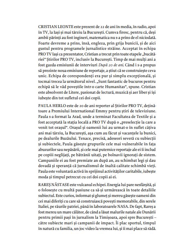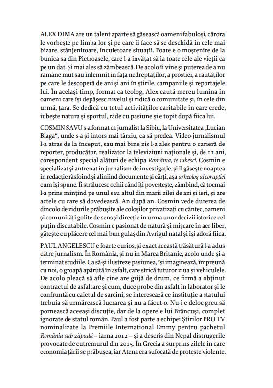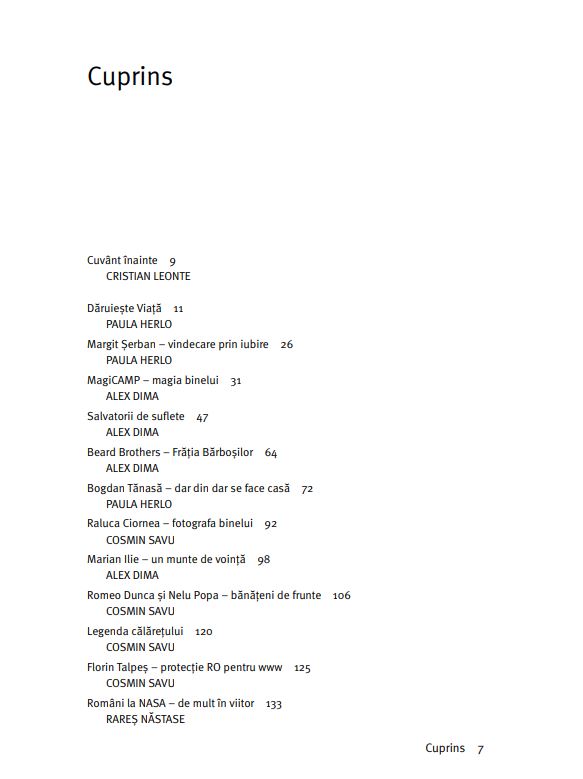 Oamenii care fac binele sunt eroii acestei cărți. Oameni care s-au ridicat deasupra propriei condiții, unii deasupra vremurilor, și și-au dus tot mai sus visul, familia, comunitatea. Ei și ele au harul de a-i ajuta pe alții – în suferință sau în nevoie –, au darul și norocul să devină lideri în munca lor. Ei și ele sunt dovezi că se poate, că voința și munca aduc rezultate, împlinire și chiar fericirea, după 30 de ani în care prea mulți români au fost alungați din țară de lipsa oportunităților oneste, de incompetenți sau ticăloși instalați peste noapte în posturi de decizie, de proiecte veșnic neîncepute vândute ca promisiuni ferme. Volumul acesta le este închinat oamenilor care împing lucrurile înainte în jurul lor, celor care luptă să schimbe lucruri ce se încăpățânează să rămână neschimbate.