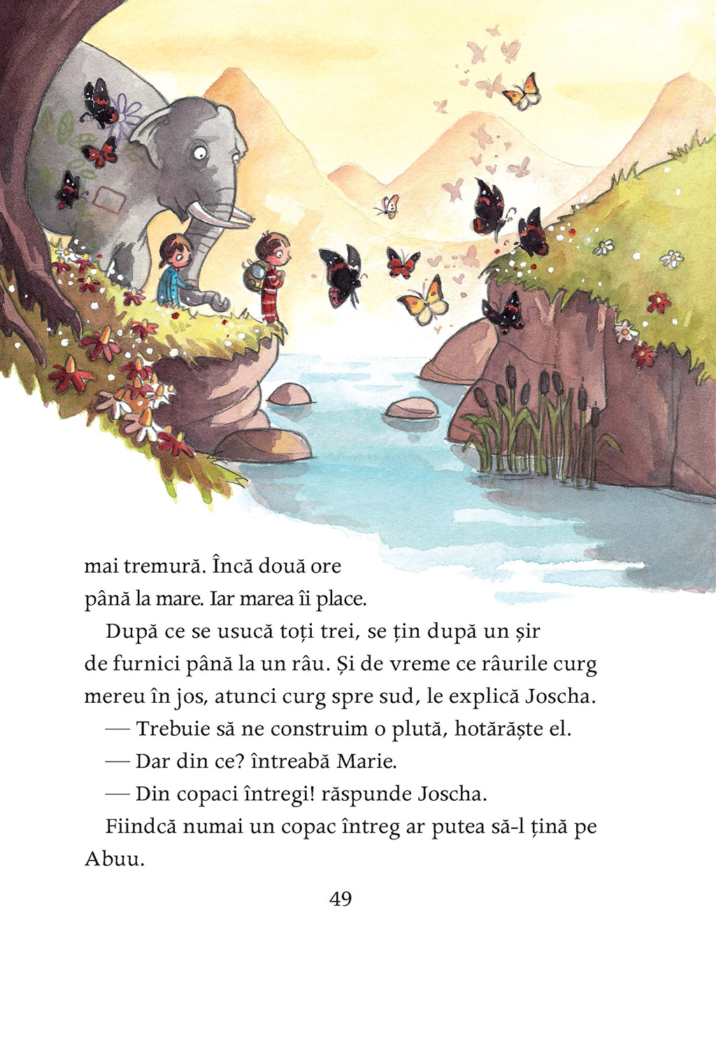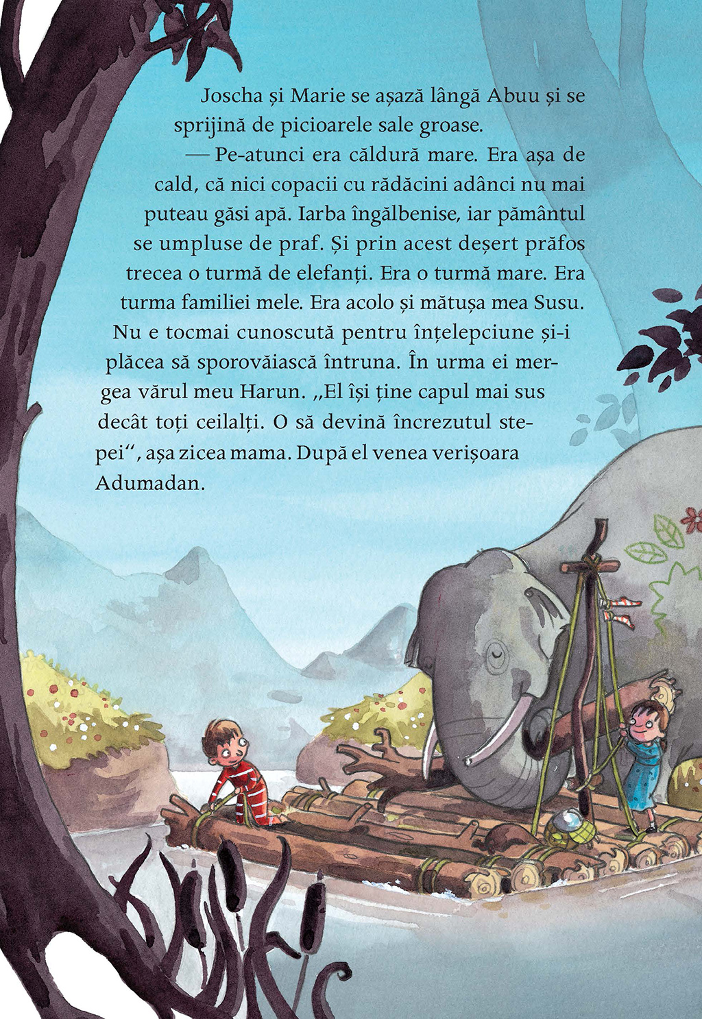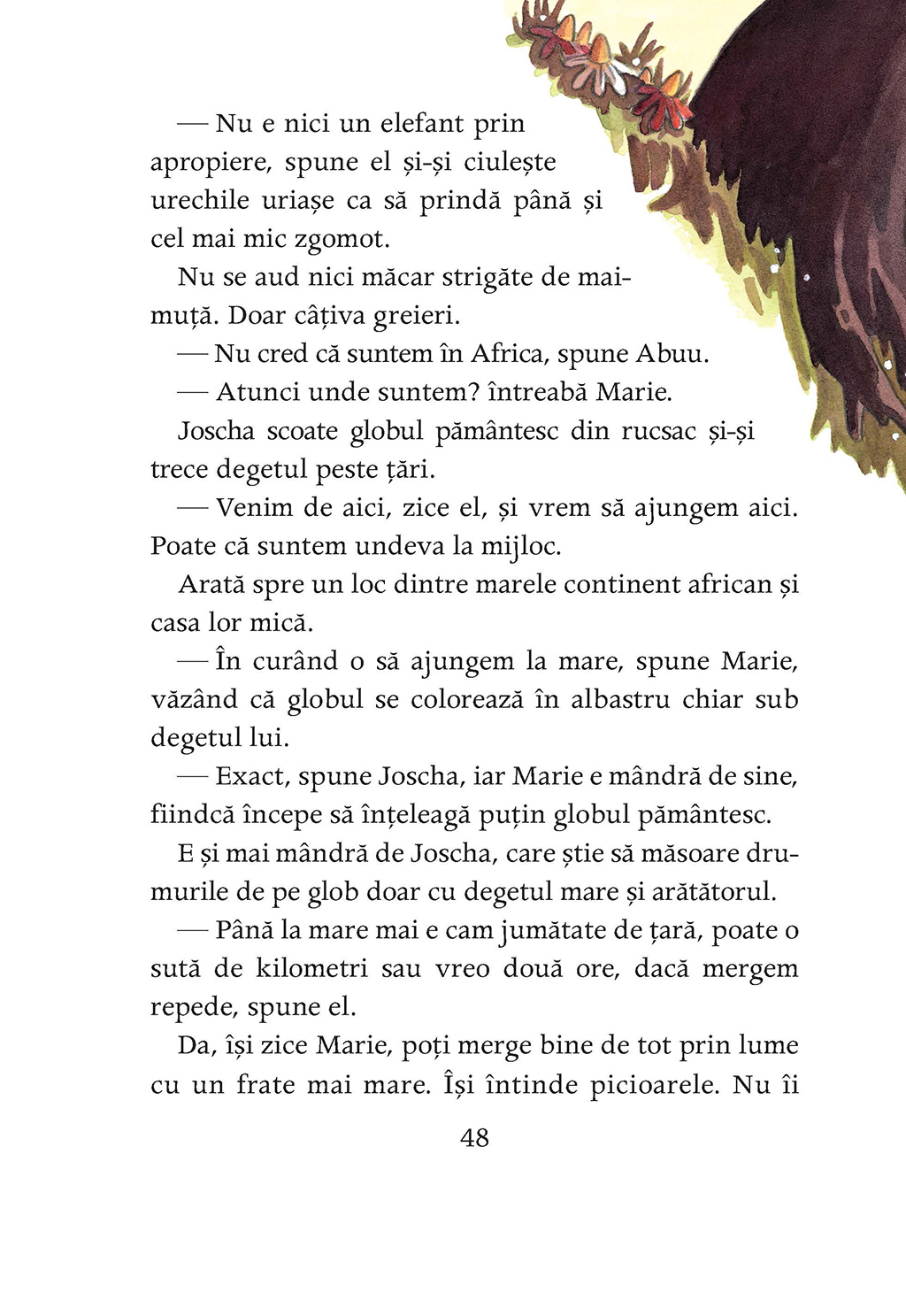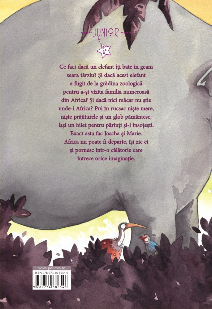 Ce faci dacă un elefant îţi bate în geam seara tîrziu? Şi dacă acest elefant a fugit de la grădina zoologică pentru a-şi vizita familia numeroasă din Africa? Şi dacă nici măcar nu ştie unde-i Africa? Pui în rucsac nişte mere, nişte prăjiturele şi un glob pămîntesc, laşi un bilet pentru părinţi şi-l însoţeşti. Exact asta fac Joscha şi Marie. Africa nu poate fi departe, îşi zic ei şi pornesc într-o călătorie care întrece orice imaginaţie.
