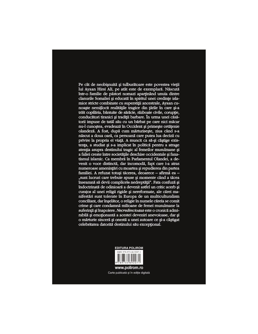 Pe cât de neobișnuită și tulburătoare este povestea vieții lui Ayaan Hirsi Ali, pe atât este de exemplară. Născută într-o familie de păstori nomazi aparținând unuia dintre clanurile Somaliei și educată în spiritul unei credințe islamice stricte combinate cu superstiții ancestrale, Ayaan cunoaște nemijlocit realitățile tragice din țările în care și-a trăit copilăria, bântuite de sărăcie, războaie civile, corupție, conducători tiranici și tradiții barbare. În urma unei căsătorii impuse de tatăl său cu un bărbat pe care nici măcar nu-l cunoștea, evadează în Occident și primește cetățenie olandeză. A fost, după cum mărturisește, ziua când s-a născut a doua oară, ca persoană care putea lua decizii cu privire la propria ei viață. A muncit ca să-și câștige existența, a studiat și s-a implicat în politică pentru a atrage atenția asupra destinului tragic al femeilor musulmane și a faliei create între societățile deschise occidentale și fanatismul islamic. Ca membră în Parlamentul Olandei, a devenit o voce distinctă, dar incomodă, fapt care i-a atras numeroase amenințări cu moartea și repudierea din partea familiei. A refuzat totuși tăcerea, deoarece – afirmă ea – „sunt lucruri care trebuie spuse și momente când a tăcea înseamnă să devii complicele nedreptății”. Fata confuză și îndoctrinată de odinioară a devenit astfel un critic acerb și curajos al unei religii rigide și nereformate, ale cărei manifestări sunt tolerate în Europa de un multiculturalism conciliant, dar înșelător, o religie în numele căreia se comit crime și care condamnă milioane de femei musulmane la suferință și înapoiere. Necredincioasa este o cronică admirabilă și emoționantă a acestei deveniri anevoioase, dar și o mărturie sinceră și onestă a unei autoare ce și-a câștigat celebritatea datorită destinului său excepțional.