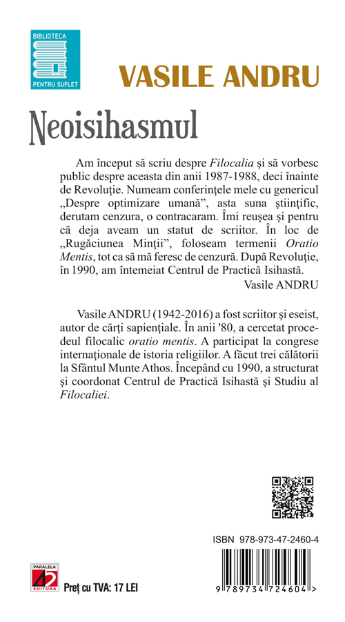 Vasile ANDRU (1942-2016) a fost scriitor şi eseist, autor de cărţi sapienţiale. În anii '80, a cercetat proce-deul filocalic oratio mentis. A participat la congrese internaţionale de istoria religiilor. A făcut trei călătorii la Sfântul Munte Athos. Începând cu 1990, a structurat şi coordonat Centrul de Practică Isihastă şi Studiu al Filocaliei.