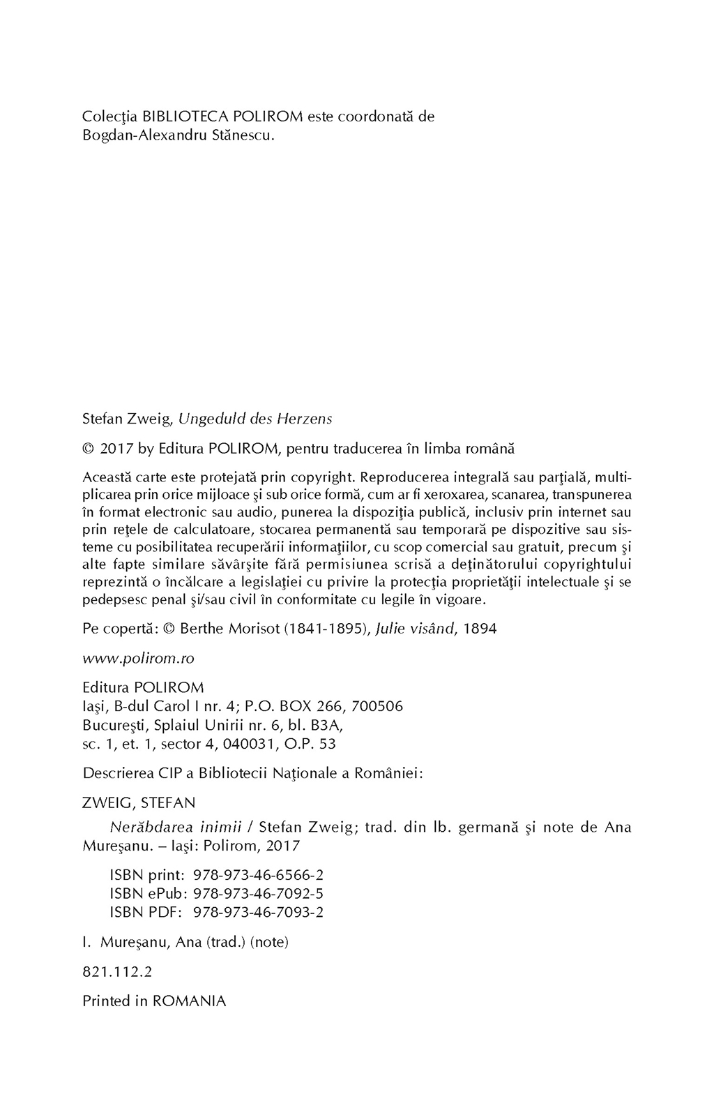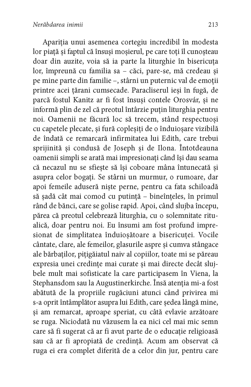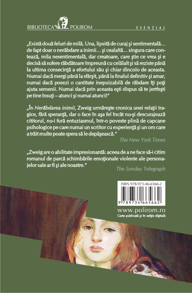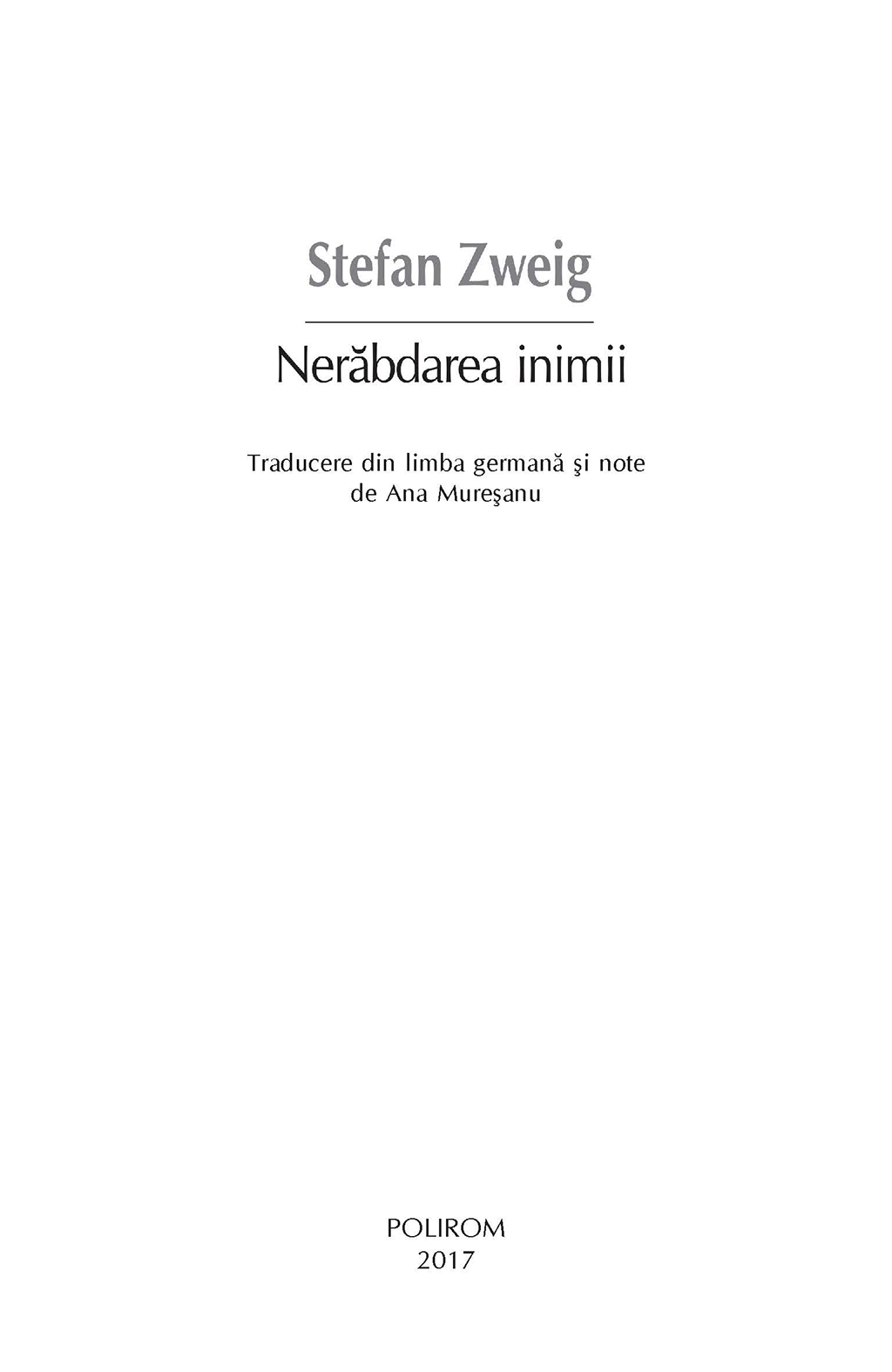 1913. Într-un orăşel austriac de garnizoană, ofiţerul de cavalerie Anton Hofmiller e invitat la castelul bogatului proprietar Kekesfalva. Cînd petrecerea e în toi, tînărul o invită la dans pe fiica gazdei, fără să ştie că e paralizată – iar apoi, vrînd să-şi repare stîngăcia, face greşeli după greşeli, pe care le pune pe seama a ceea ce Stefan Zweig numeşte „nerăbdarea inimii”. E singurul roman pe care Zweig l-a scris pînă la capăt, iar personajele sale sînt martori năuci ai propriei catastrofe, simboluri ale unei civilizaţii în plin dezastru, dar care nu găseşte puterea să se împotrivească ritmului ameţitor al unui ultim vals. Strălucitor şi rafinat, scrisul lui Zweig e ceea ce rămîne din lumea înghiţită de nebunia secolului XX. O sfîşietoare poveste de dragoste, în care vedem cum soarta îi face orbi pe-aceia pe care vrea să-i piardă.