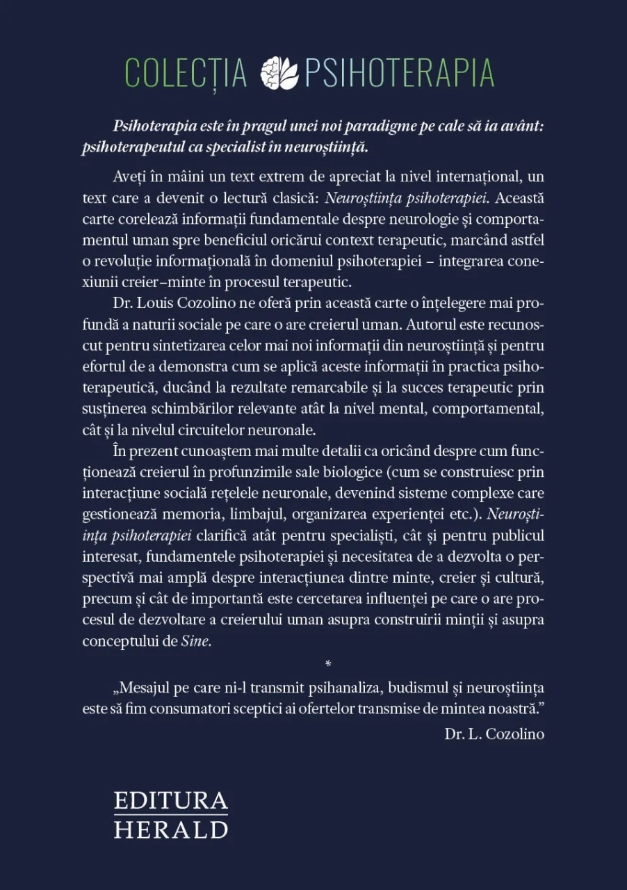 O carte revoluționară care explorează descoperirile recente din psihoterapie, care au adus în prim-plan înțelegerea naturii sociale a creierului uman în context terapeutic. Louis Cozolino este recunoscut pentru capacitatea sa de a sintetiza informațiile din neuroștiință și de a demonstra modul în care acestea pot fi aplicate în practica psihoterapeutică