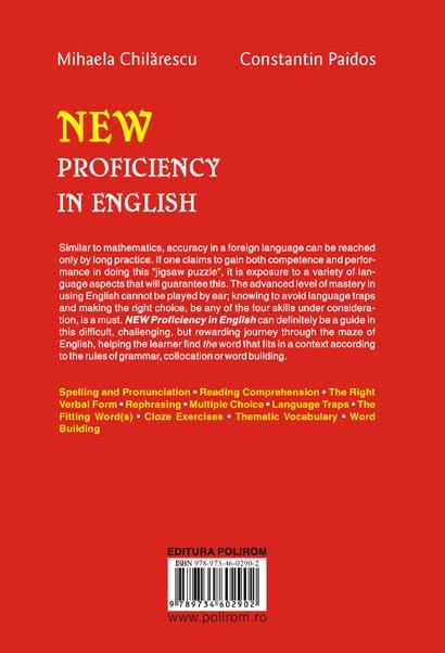 La fel ca in matematica, intr-o limba straina acuratetea poate fi obtinuta doar printr-o practica indelungata. Pentru cel ce doreste sa atinga competenta si performanta in acest puzzle, doar familiarizarea cu o varietate de aspecte ale limbii ii poate garanta acest lucru. Nivelul avansat in utilizarea limbii engleze presupune evitarea capcanelor limbii si alegerea variantei corecte, in fiecare dintre cele patru abilitati luate in considerare. NEW Proficiency in English constituie cu siguranta un ghid in aceasta calatorie dificila, dar provocatoare in labirintul limbii engleze, ajutindu-l pe cel ce invata sa gaseasca cuvintul potrivit intr-un anumit context, in functie de regulile gramaticale sau lexicale. Lucrarea este insotita de un caiet cu solutiile exercitiilor. (Key to Exercises: 115X165 mm, 72 p.)