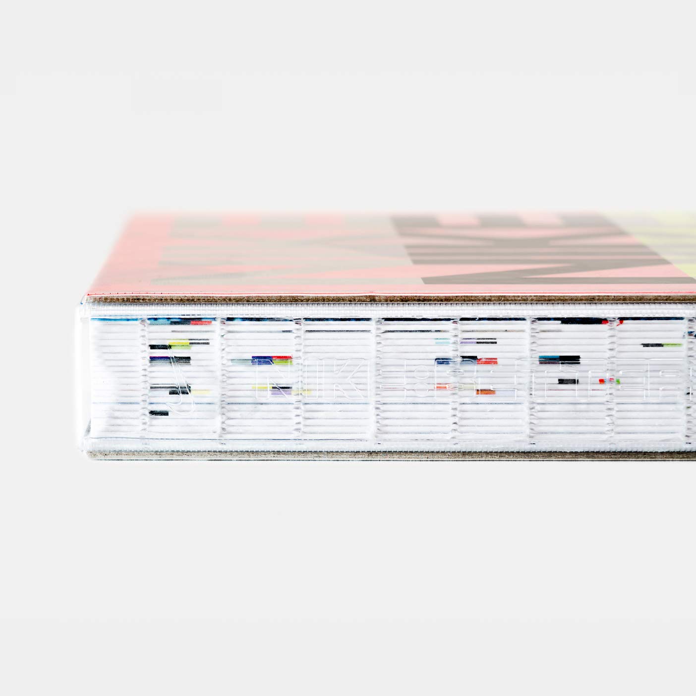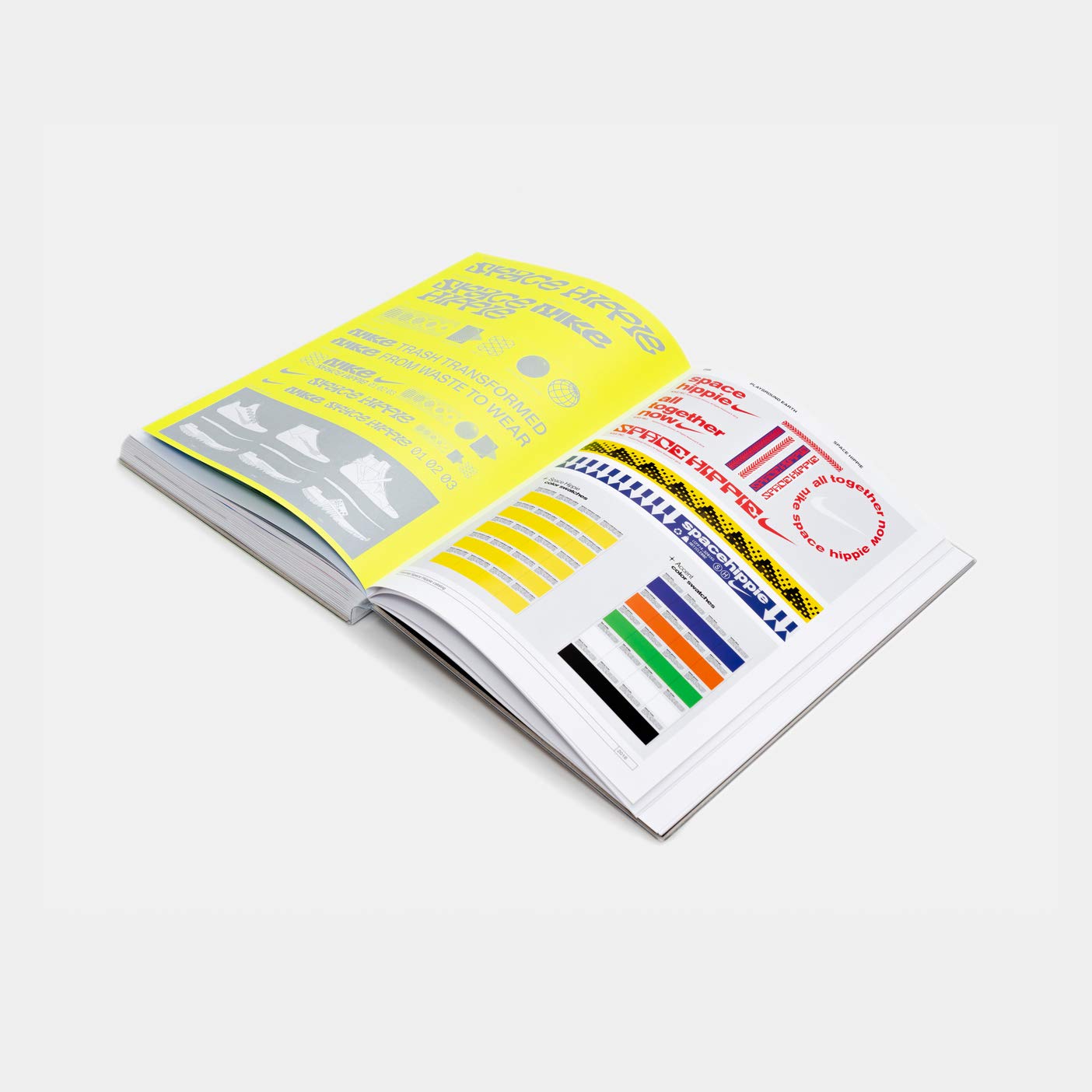 The book's extraordinary design also nods to its contents. The striking cover features overlapping silkscreened layers of Nike's proprietary Volt yellow and Hyperpunch pink colors overlaying an image of world-champion marathoner Eliud Kipchoge printed in a half-tone dot pattern. The book's spine, visible through the clear jacket, showcases a series of colored tabs that extend from its interior pages and which are referenced in the book's bonus chapter, "Crafting Color."