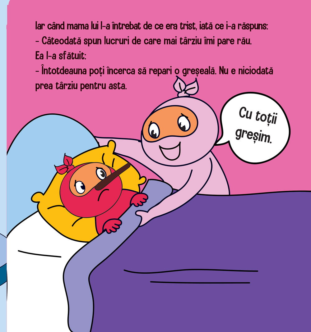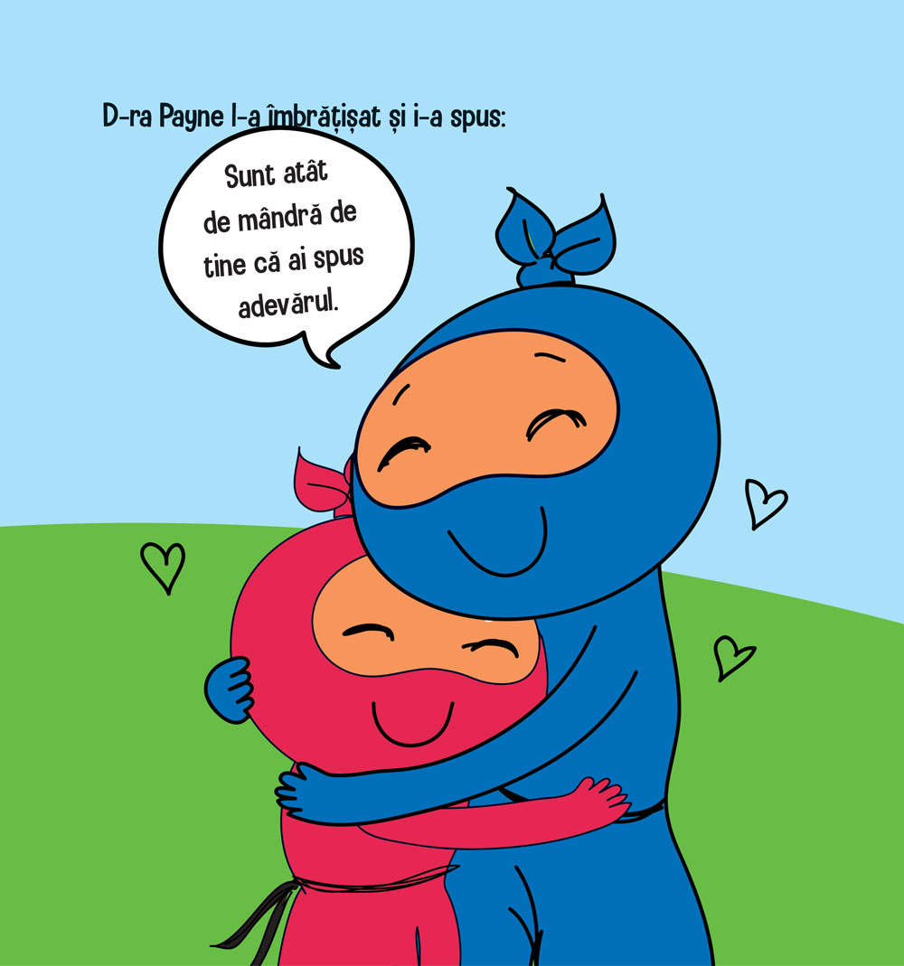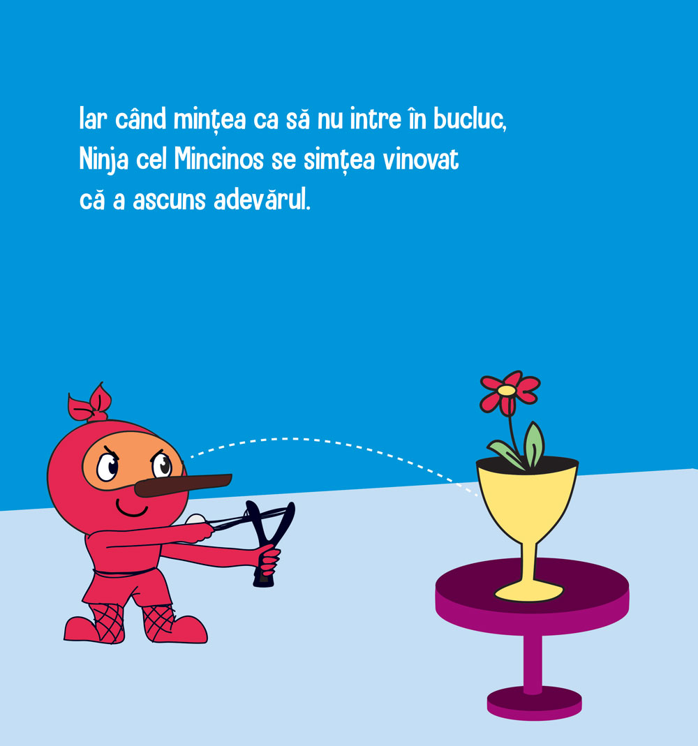 Ninja cel Mincinos / Dishonest Ninja de Mary Nhin, cu ilustrații de Jelena Stupar, este o frumoasă poveste educativă despre minciună. Știm cu toții că copiii au deseori tendința să se transforme în mici Pinocchio spunând minciunele pentru a se distra, pentru a se disculpa sau pur și simplu pentru a se da mari. Însă minciuna este un obicei periculos care trebuie descurajat de la cele mai mici vârste pentru a nu prinde rădăcini periculoase. Astfel, povestea de față îl va face pe micuțul tău să înțeleagă că minciuna poate evolua rapid de la o simplă distracție, la o faptă gravă, care îi afectează pe cei din jur, de aceea, când vine vorba de a alege între a spune adevărul și a minți, alegerea cea mai înțeleaptă este întotdeauna adevărul...„Trucuri Ninja” este o serie de 32 de cărți de dezvoltare personală pentru copii școlari și preșcolari care a fost concepută cu scopul de a le oferi copiilor deprinderi valoroase de viață, însă poate constitui o resursă excelentă și pentru consilieri școlari, învățători și profesori.