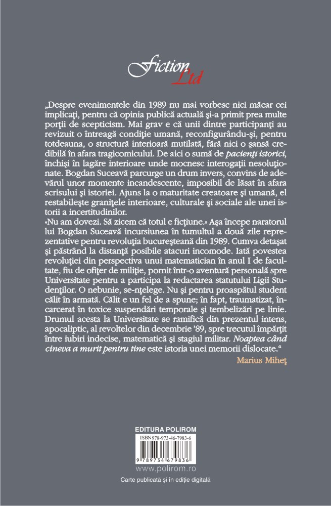 «Nu am dovezi. Să zicem că totul e ficțiune.» Așa începe naratorul lui Bogdan Suceavă incursiunea în tumultul a două zile reprezentative pentru revoluția bucureșteană din 1989. Cumva detașat și păstrînd la distanță posibile atacuri incomode. Iată povestea revoluției din perspectiva unui matematician în anul I de facultate, fiu de ofițer de miliție, pornit într-o aventură personală spre Universitate pentru a participa la redactarea statutului Ligii Studenților. O nebunie, se-nțelege. Nu și pentru proaspătul student călit în armată. Călit e un fel de a spune; în fapt, traumatizat, încarcerat în toxice suspendări temporale și tembelizări pe linie. Drumul acesta la Universitate se ramifică din prezentul intens, apocaliptic, al revoltelor din decembrie ’89, spre trecutul împărțit între iubiri indecise, matematică și stagiul militar. Noaptea cînd cineva a murit pentru tine este istoria unei memorii dislocate.” (Marius Miheț)