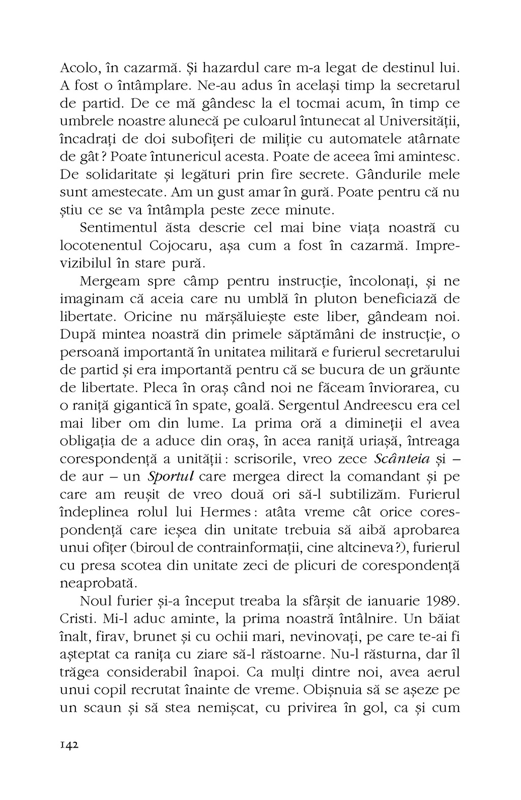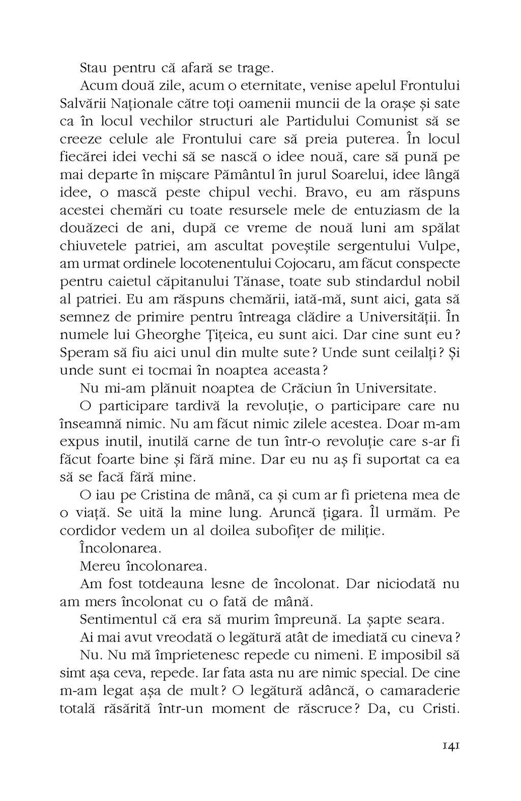 „Despre evenimentele din 1989 nu mai vorbesc nici măcar cei implicați, pentru că opinia publică actuală și-a primit prea multe porții de scepticism. Mai grav e că unii dintre participanți au revizuit o întreagă condiție umană, reconfigurîndu-și, pentru totdeauna, o structură interioară mutilată, fără nici o șansă credibilă în afara tragicomicului. De aici o sumă de pacienți istorici, închiși în lagăre interioare unde mocnesc interogații nesoluționate. Bogdan Suceavă parcurge un drum invers, convins de adevărul unor momente incandescente, imposibil de lăsat în afara scrisului și istoriei. Ajuns la o maturitate creatoare și umană, el restabilește granițele interioare, culturale și sociale ale unei istorii a incertitudinilor.