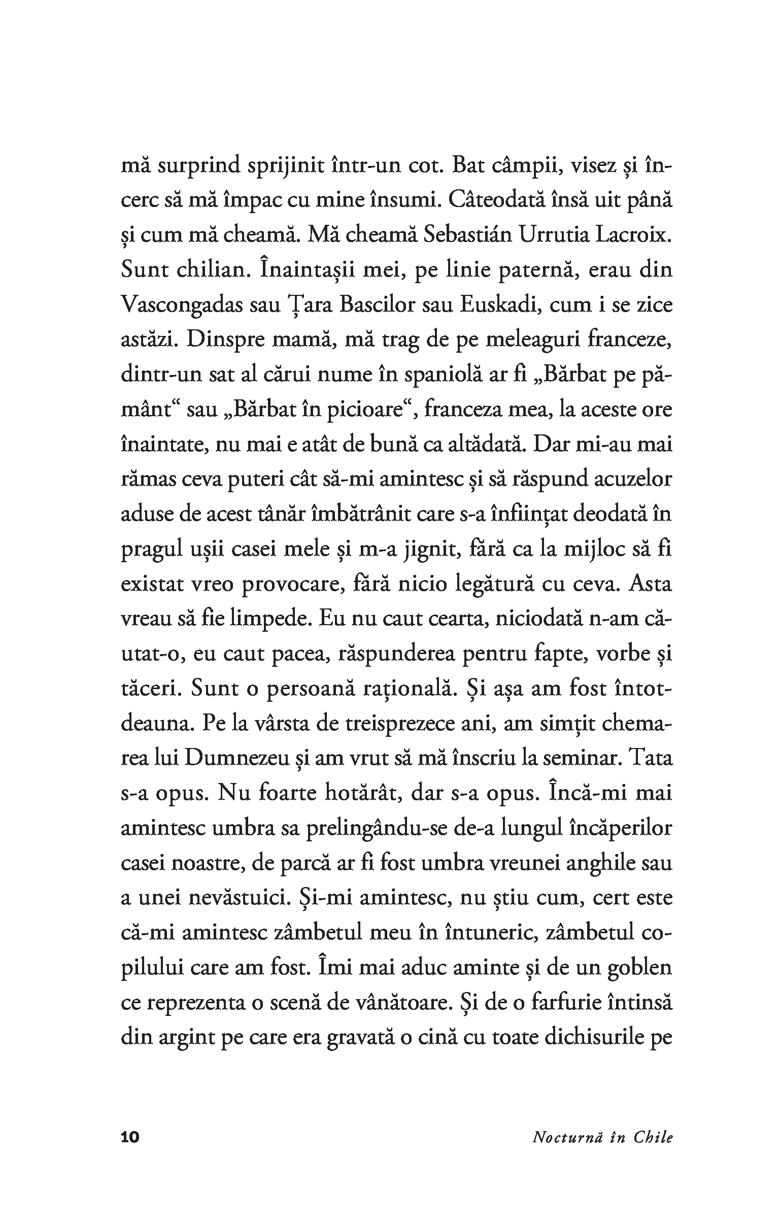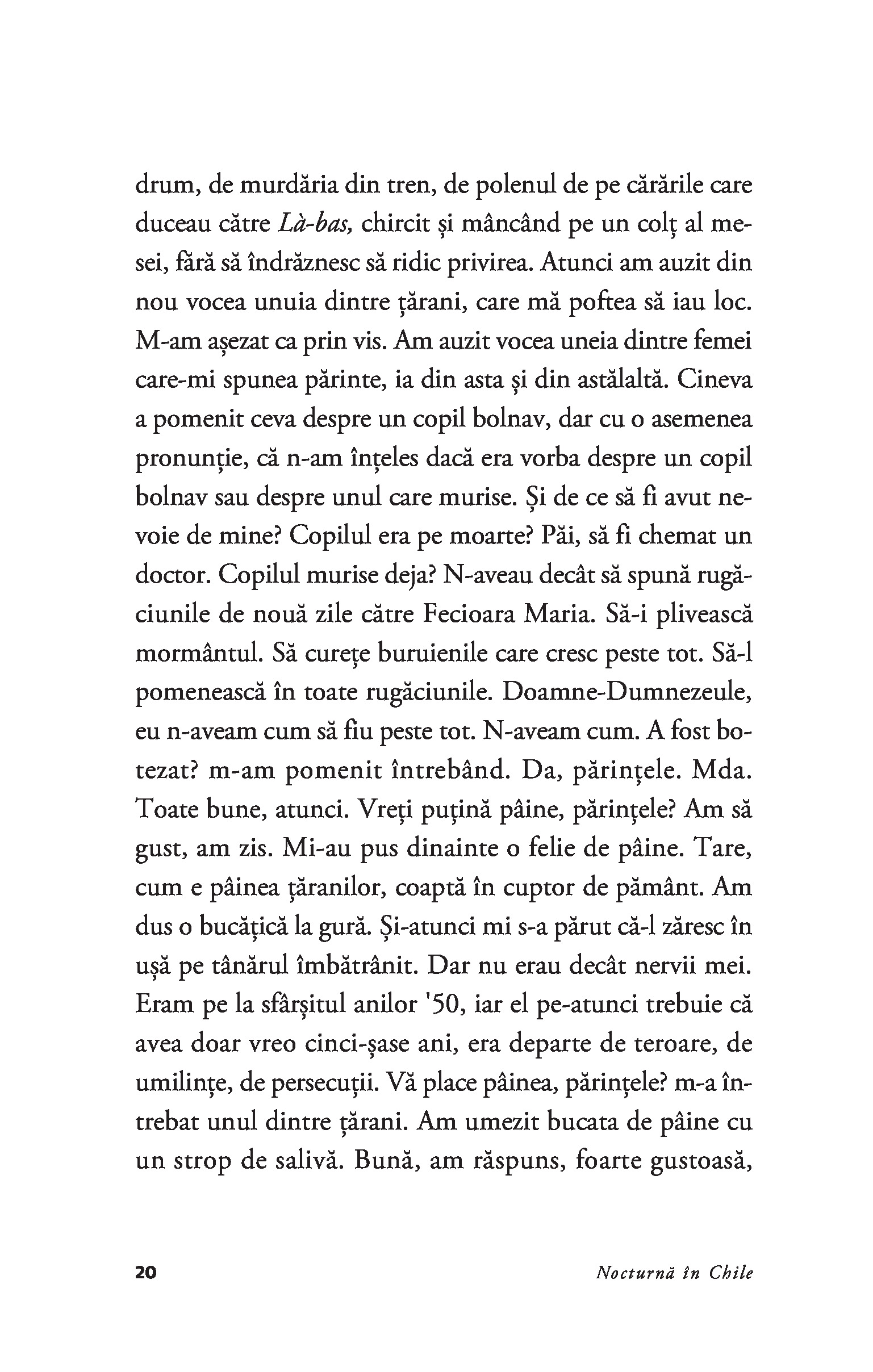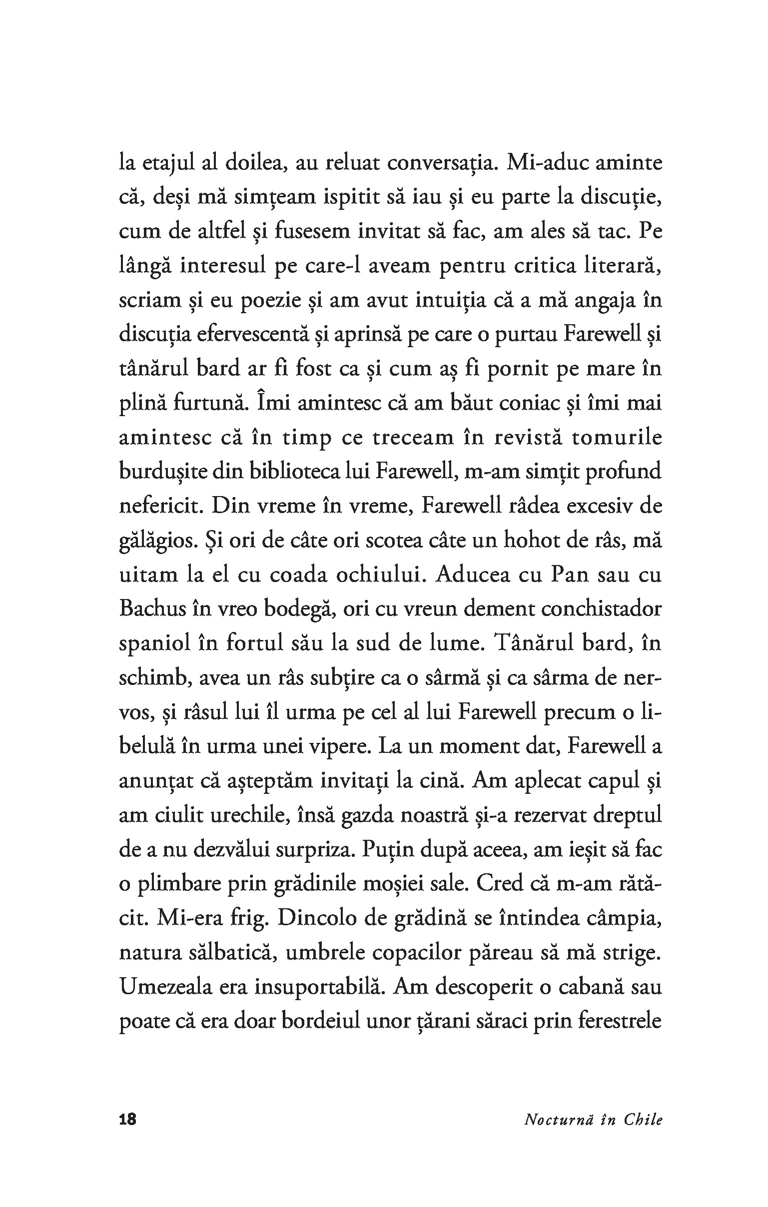 Romanul care l-a proiectat pe Roberto Bolaño pe scena literară internațională, Nocturnă în Chile reprezintă mărturia de pe patul de moarte a lui Sebastián Urrutia Lacroix – preot catolic, membru al Opus Dei, critic literar de mare finețe și poet ratat –, bântuit de voci și figuri din trecut.