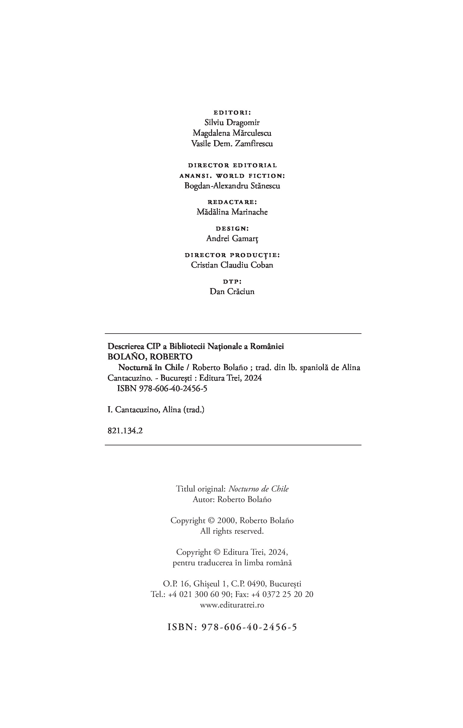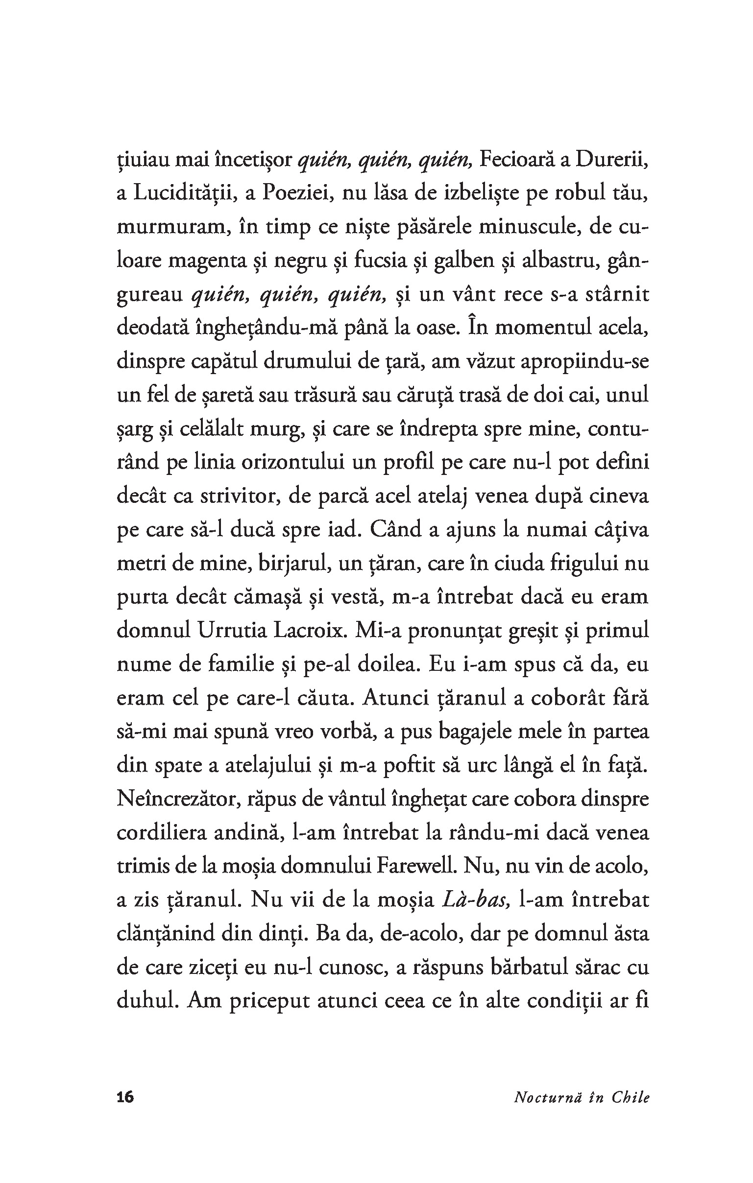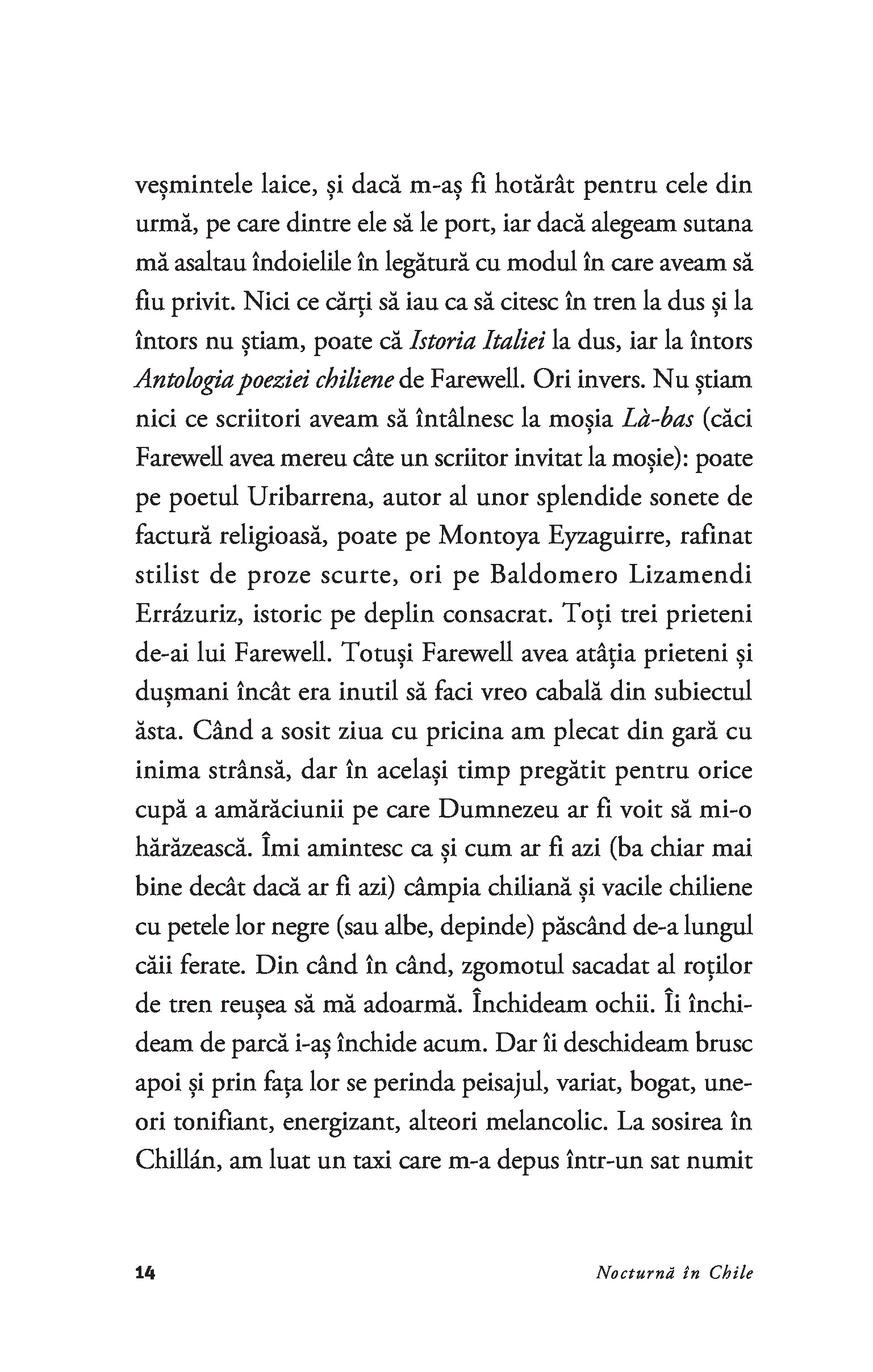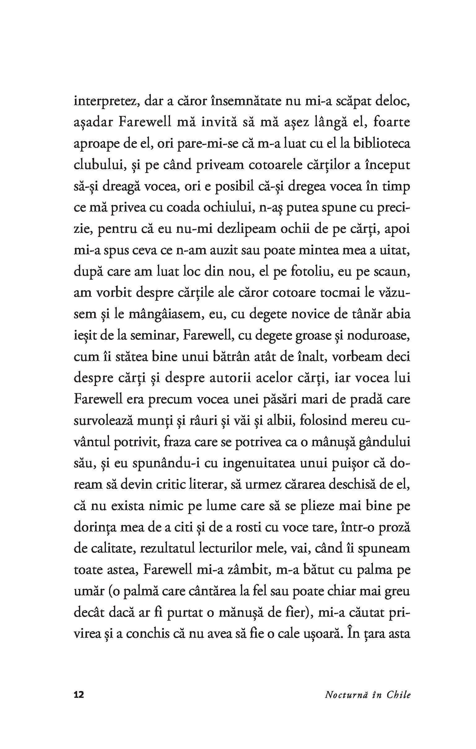 Romanul care l-a proiectat pe Roberto Bolaño pe scena literară internațională, Nocturnă în Chile reprezintă mărturia de pe patul de moarte a lui Sebastián Urrutia Lacroix – preot catolic, membru al Opus Dei, critic literar de mare finețe și poet ratat –, bântuit de voci și figuri din trecut.