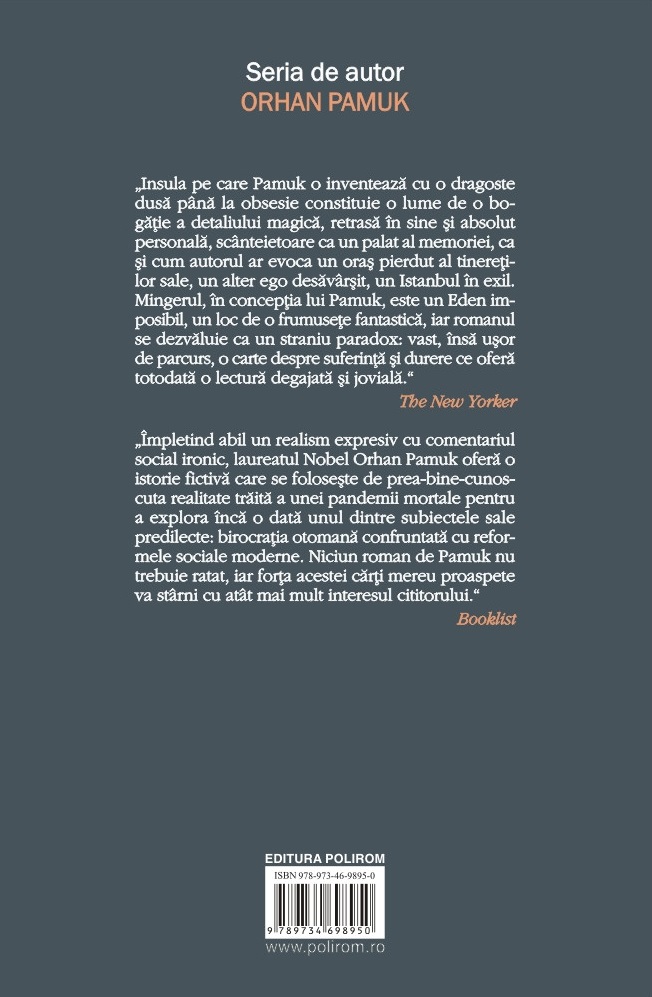 „Insula pe care Pamuk o inventează cu o dragoste dusă până la obsesie constituie o lume de o bogăție a detaliului magică, retrasă în sine și absolut personală, scânteietoare ca un palat al memoriei, ca și cum autorul ar evoca un oraș pierdut al tinereților sale, un alter ego desăvârșit, un Istanbul în exil. Mingerul, în concepția lui Pamuk, este un Eden imposibil, un loc de o frumusețe fantastică, iar romanul se dezvăluie ca un straniu paradox: vast, însă ușor de parcurs, o carte despre suferință și durere ce oferă totodată o lectură degajată și jovială.” (The New Yorker)
