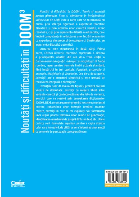 Noutăți și dificultăți în DOOM3. Teorie și exerciții pentru gimnaziu, liceu și admiterea în învățământul universitar de profil este o carte care se recomandă nu numai prin selecția riguroasă a aspectelor teoretice discutate și prin oferirea unor exerciții variate, atent rezolvate, ci și prin experiența diferită a autoarelor, care îmbină competența în redactarea unor lucrări academice cu experiența din procesul de evaluare și, bineînțeles, cu experiența didactică autentică.