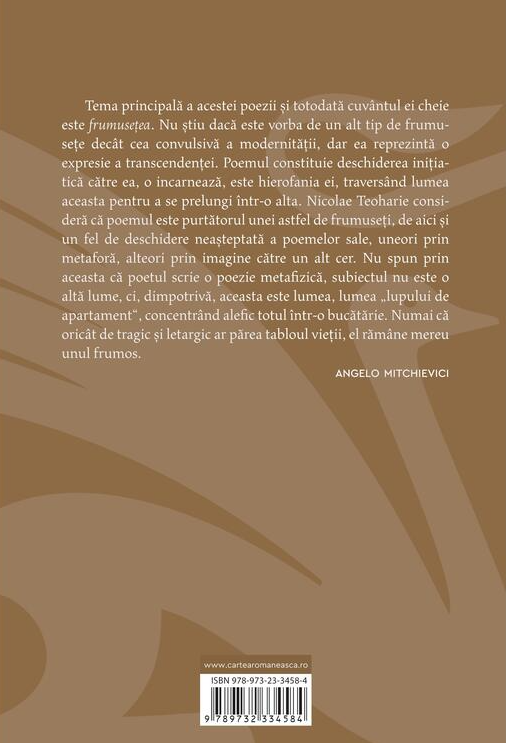 Nicolae Teoharie consideră că poemul este purtătorul unei astfel de frumuseți, de aici și un fel de deschidere neașteptată a poemelor sale, uneori prin metaforă, alteori prin imagine către un alt cer.