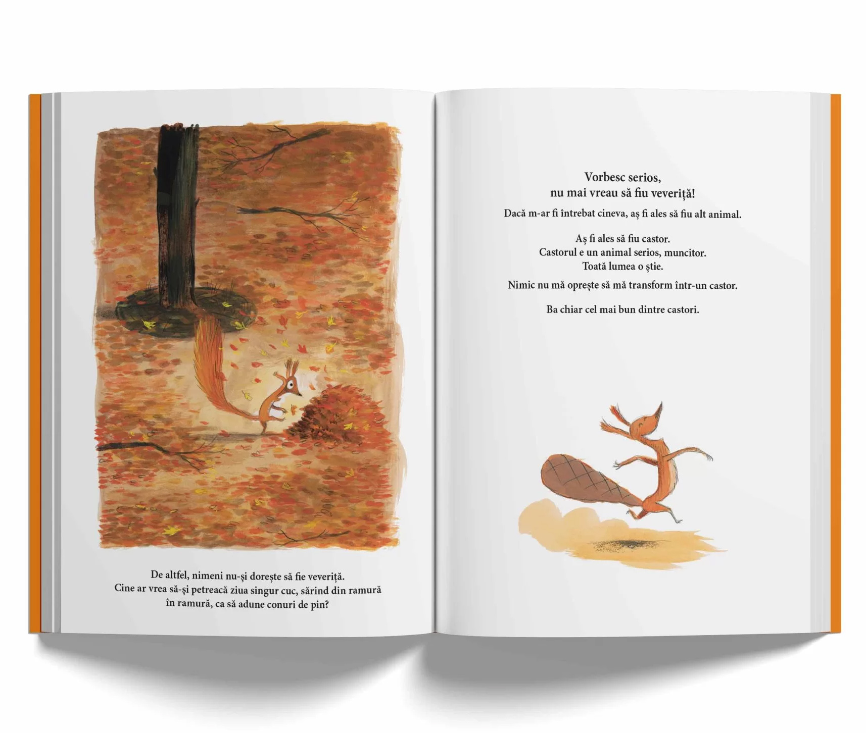 Protagonistul, o mică veveriță, își dorește să fie altceva decât este — un castor, un cerb, o bufniță sau chiar un arici. Pe măsură ce își imaginează aceste transformări, își dă seama că fiecare rol vine cu propriile provocări și bucurii. Povestea îmbină umorul cu reflecții profunde asupra identității și acceptării de sine, inspirând copiii să aprecieze unicitatea lor.