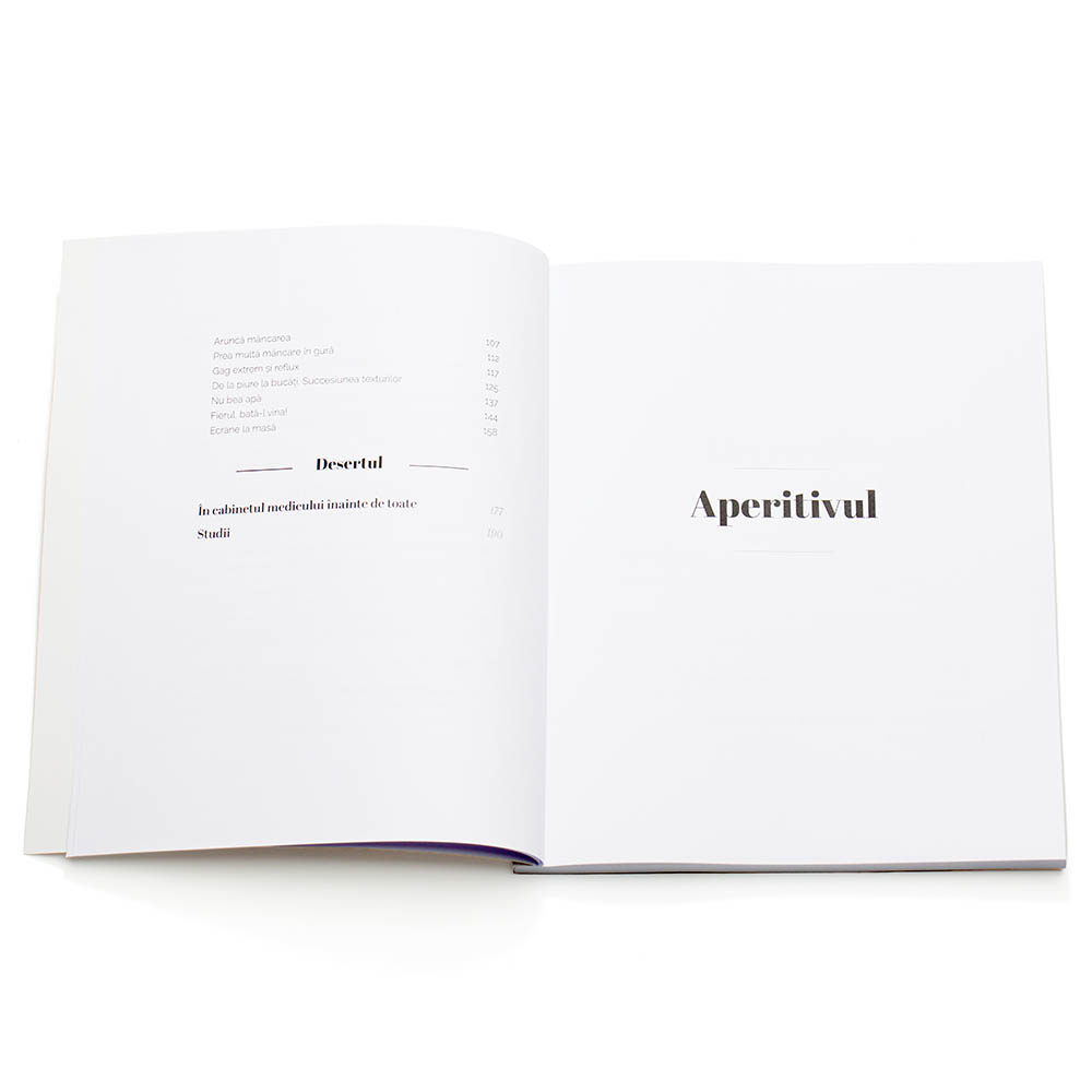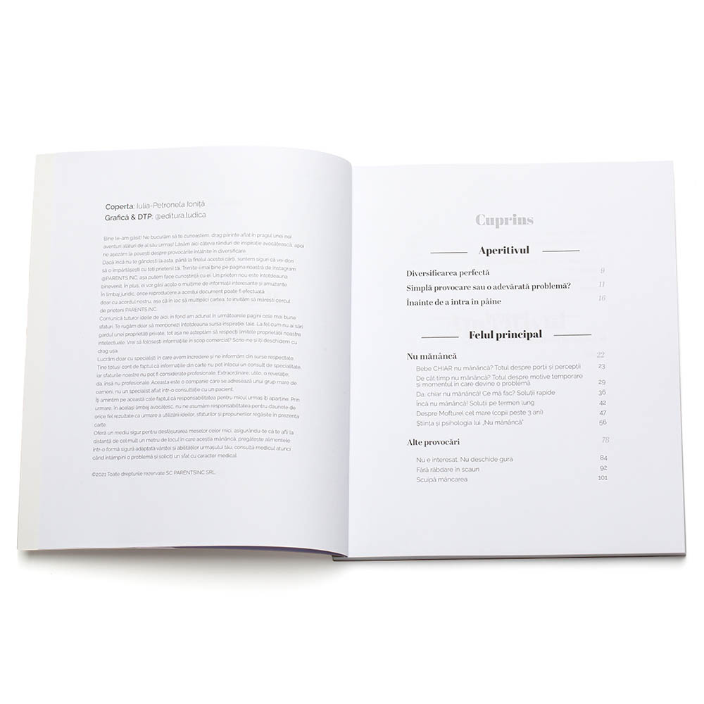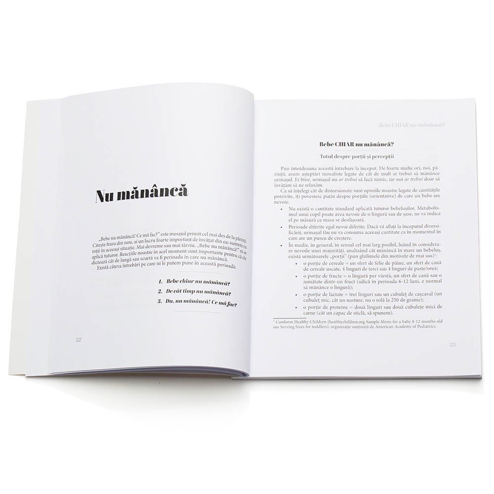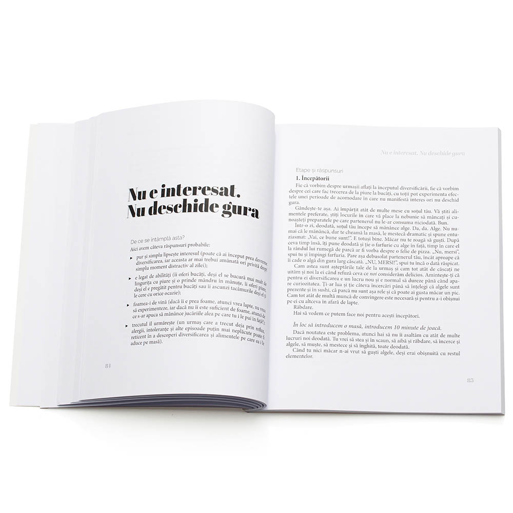 - explicații, soluții pe termen scurt și soluții pe termen lung pentru zece din cele mai des întâlnite provocări în diversificare – nu este interesat, nu deschide gura; nu are răbdare în scaun; scuipă mâncarea; aruncă mâncarea; prea multă mâncare în gură; gag extrem și reflux; trecerea de la piure la bucăți; nu bea apă; probleme cu fierul; folosirea ecranelor la masă.