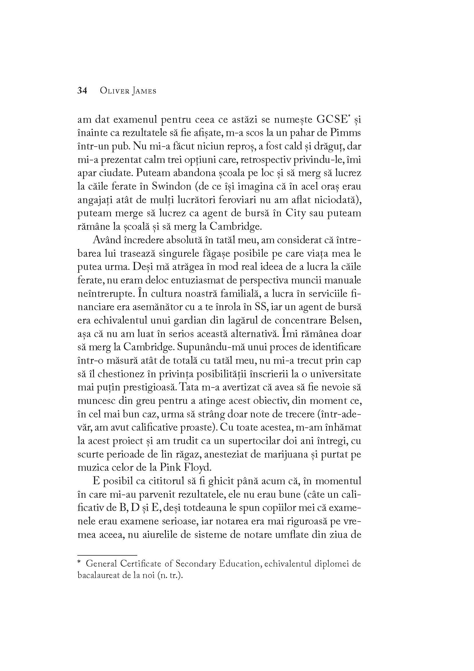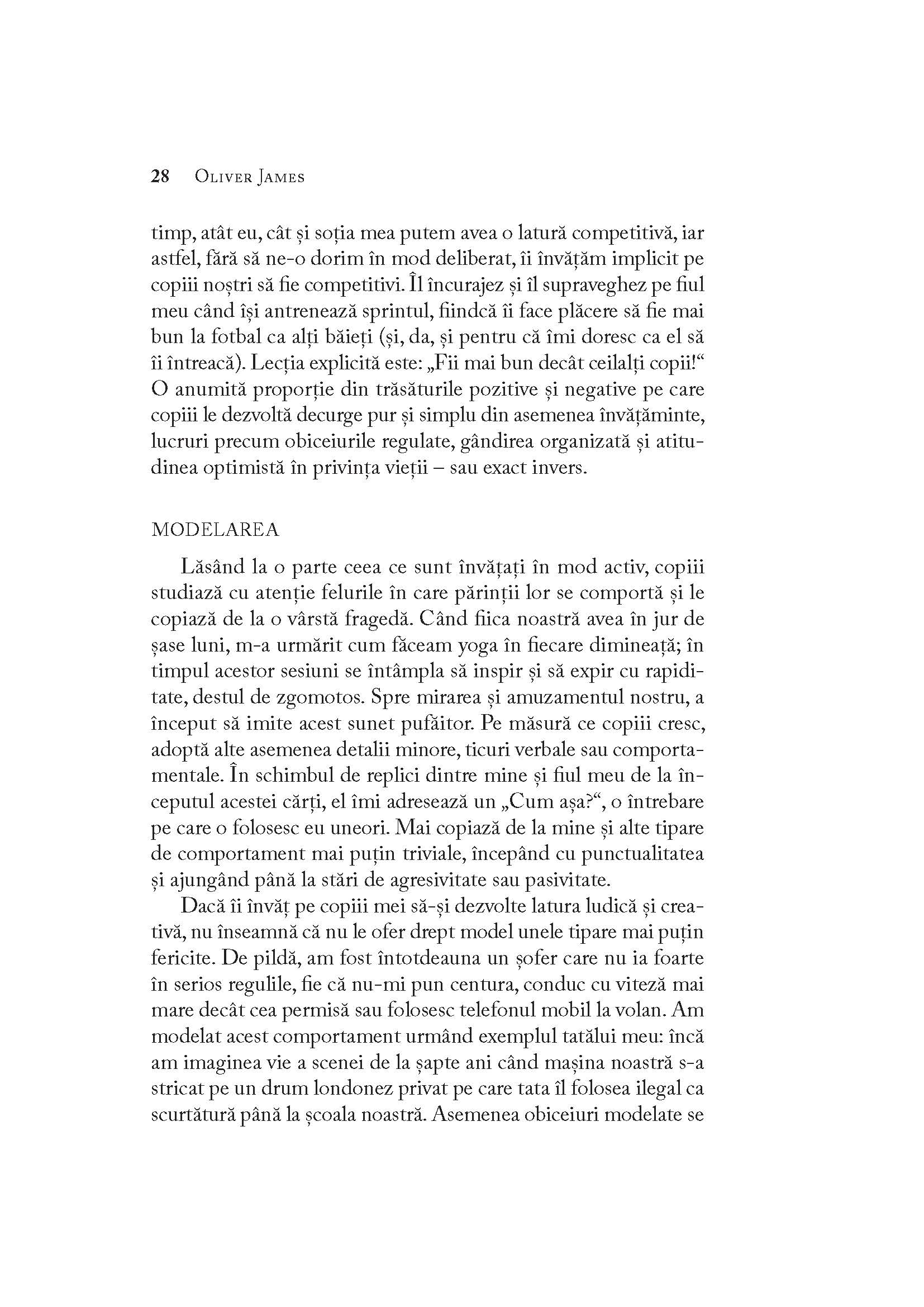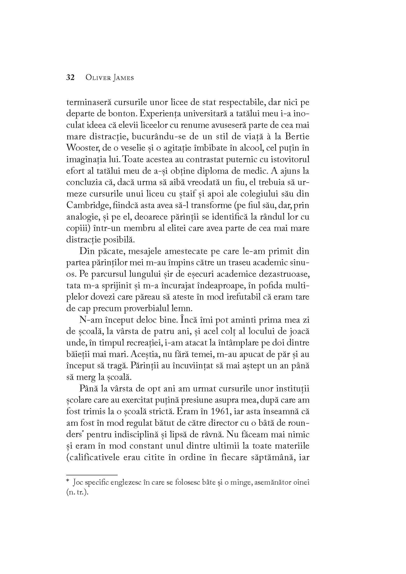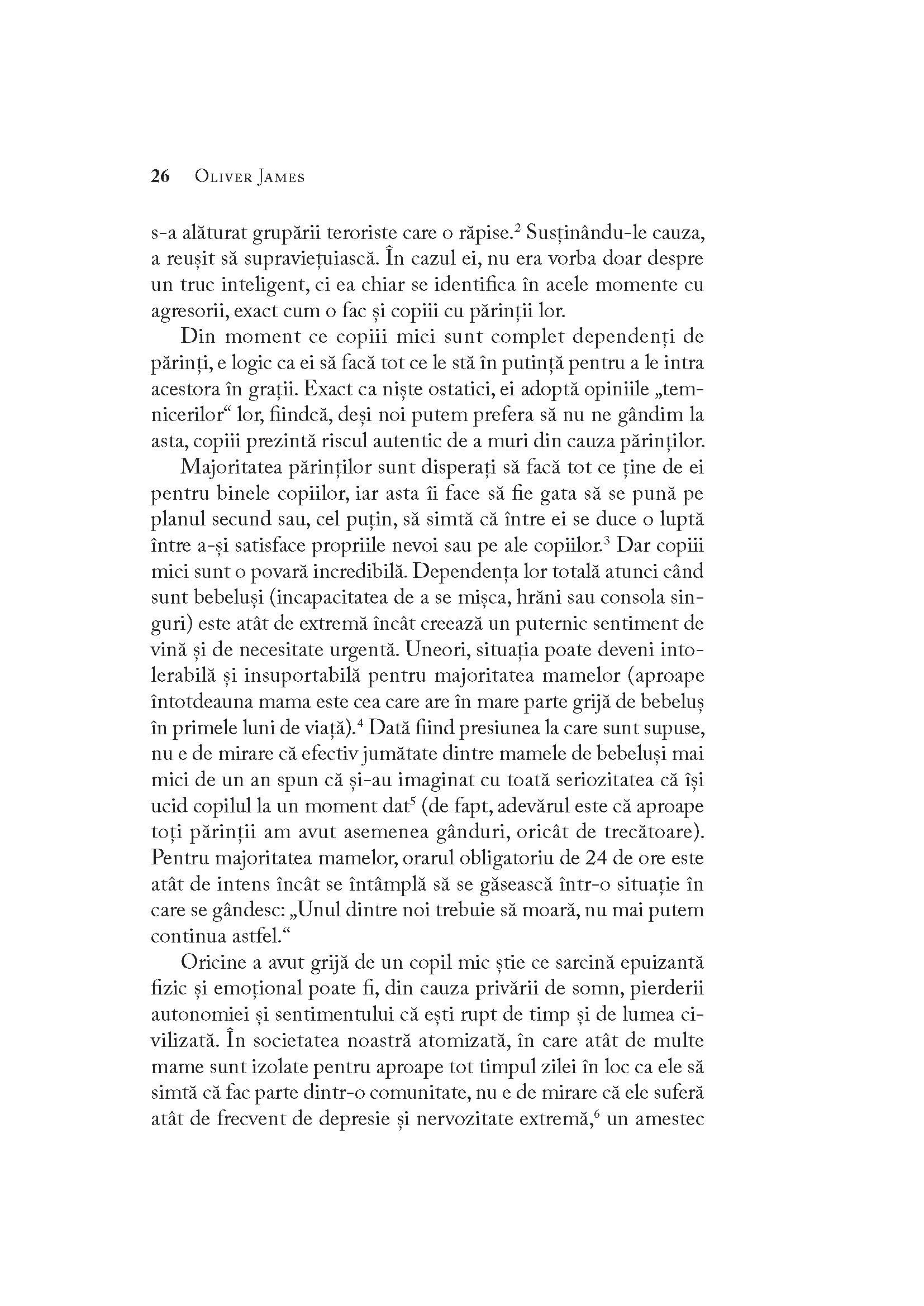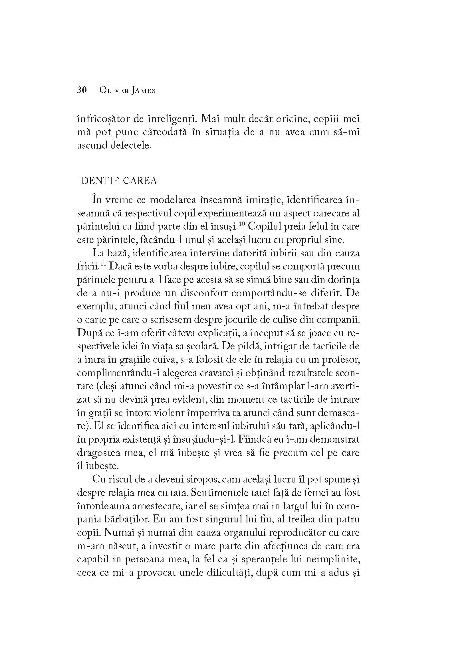 Oliver JAMES, psiholog de renume mondial, lucrează din 1988 ca scriitor, jurnalist, prezentator TV şi producător de documentare pentru televiziune. Printre bestsellerurile sale se numără Afluenza (Vellant, 2009), Juvenile Violence in a Winner-Loser Culture, Britain on the Couch și Politica de birou (Vellant, 2014). Este membru în consiliul de administraţie al SPECAL (organizaţie caritabilă adresată bolnavilor de Alzheimer) şi în cel al Homestart (fundaţie caritabilă pentru copii) şi oferă consultanţă în domeniul politicii sociale. Trăieşte în Oxfordshire împreună cu soţia şi cei doi copii.